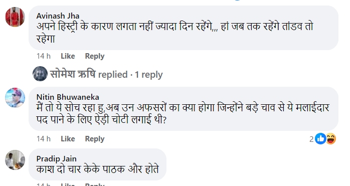 फेसबुक पर कुछ यूजरों ने लिखा कि ये जबतक रहेंगे उस विभाग में तांडव रहेगा. तो कोई यूजर पैरवी पर पोस्टिंग पाने वाले अफसरों की चुटकी लेते दिखे. वहीं ऐसे अफसरों की संख्या और होने की भी बात लोग कर रहे हैं.