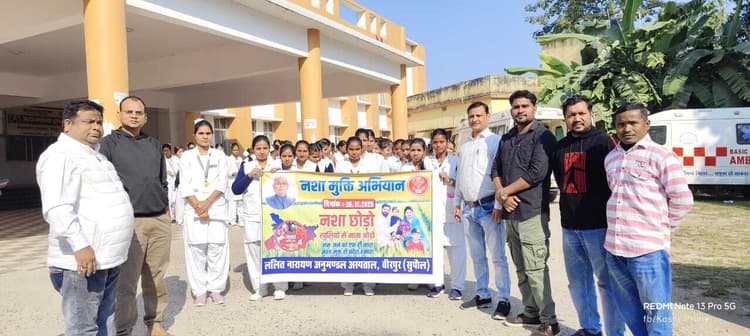 वीरपुर. विश्व नशा मुक्ति दिवस के मौके पर अनुमंडल अस्पताल परिसर से बुधवार की सुबह एएनएम स्कूल की छात्राओं के द्वारा नशा मुक्ति अभियान क़ो लेकर जागरूकता रैली निकाली गई. यह जागरूकता रैली अनुमंडल अस्पताल परिसर से निकलकर गोल चौक पर गई. जहां छात्राओं ने नशा मुक्ति क़ो लेकर कई प्रकार के नारे भी लगाए. जिसके बाद पुनः जागरूकता रैली वापस अनुमंडल अस्पताल पहुंची. जहां एक नुक्कड़ नाटक भी किया गया. नाटक के माध्यम से लोगों क़ो नशा के प्रति जागरूक रहने की बात कही गई. कार्यक्रम के बाबत जानकारी देते हुए अनुमंडल अस्पताल के प्रबंधक अविनाश कुमार ने बताया कि जागरूकता रैली निकाल कर जागरूक किया गया है. कार्यक्रम का उद्देश्य लोगों के प्रति जागरूकता क़ो बढ़ावा देना है. ताकि लोग सुरक्षित रह सके. कार्यक्रम में अनुमंडल अस्पताल के उपाधीक्षक डॉ सुशील कुमार, संजीव कुमार, एस रहमान, पूनम सिन्हा, लेब टेक्निशियन आशिफ, विनोद कुमार, राजकुमार, सत्येंद्र कुमार के साथ साथ लगभग 80 छात्राएं मौजूद रही.