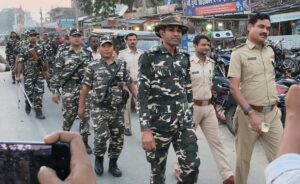 bihar election 2025 :विधानसभा चुनाव को लेकर शनिवार को थानाध्यक्ष राजेश कुमार झा के नेतृत्व में फ्लैग मार्च किया गया