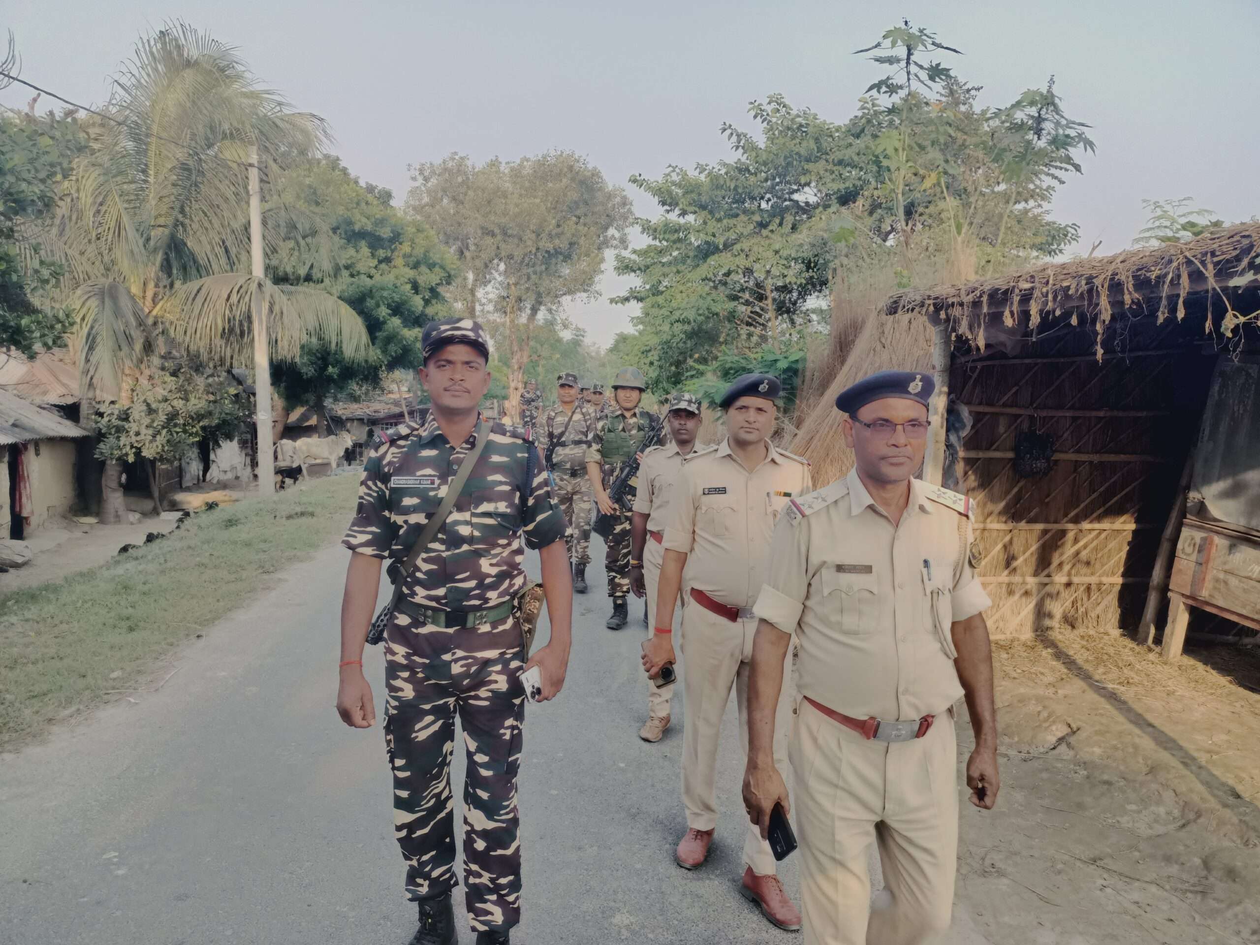 कुनौली विधानसभा चुनाव को लेकर डगमारा थाना क्षेत्र में पुलिस ने एसएसबी जवानों के साथ फ्लैग मार्च किया. डगमारा थानाध्यक्ष धनेश्वर मंडल ने बताया कि 11 नवंबर को दूसरे चरण के होने वाले विधानसभा चुनाव को लेकर सोनपुर, सिकरहट्टा, नया टोला सिकरहट्टा, डगमारा सहित अन्य क्षेत्रों में एसएसबी जवानों के साथ फ्लैग मार्च किया गया. बताया कि इस फ्लैग मार्च का मुख्य उद्देश्य चुनाव के प्रति जागरूक कर शांतिपूर्ण माहौल में सम्पन्न कराना है. उधर, कुनौली थाना पुलिस ने भी एसएसबी जवानों के साथ फ्लैग मार्च किया. कुनौली थानाध्यक्ष रौशन कुमार ने बताया कि चुनाव को लेकर क्षेत्र के कुनौली बाजार, कोसी प्रोजेक्ट चौक, बथनाहा, कुनौली बॉर्डर, कुनौली भंसार सहित अन्य क्षेत्रों में फ्लैग मार्च किया. मौके पर एएसआई महेंद्र बाबू सहित पुलिस और एसएसबी जवान मौजूद थे.