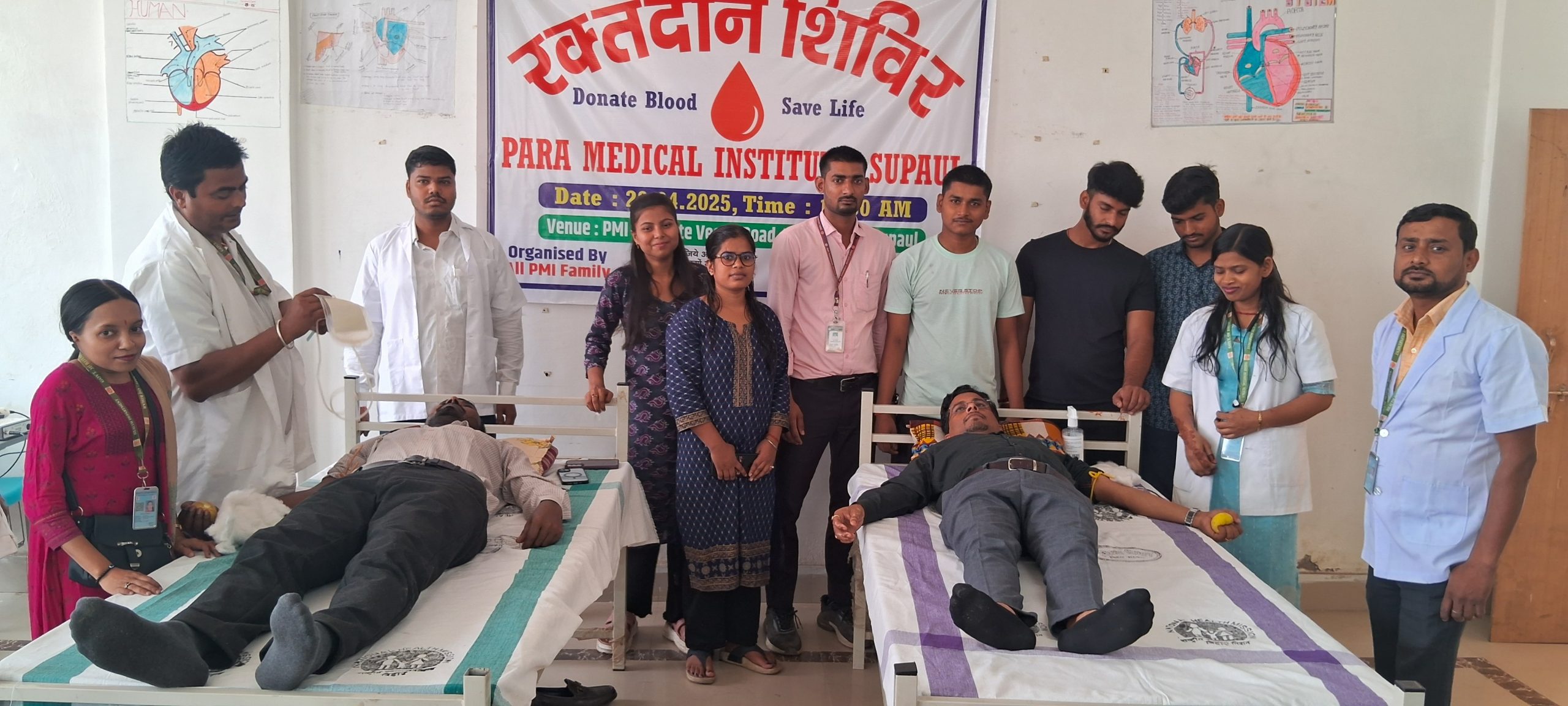 सुपौल. जिला मुख्यालय स्थित वार्ड नंबर 24 वीणा रोड में स्थित पारा मेडिकल इंस्टिट्यूट में रविवार को ऑल पीएमआई फैमिली द्वारा रक्तदान शिविर का आयोजन किया गया. रक्तदान शिविर में कुल 12 यूनिट ब्लड डोनेट किया गया. ब्लड डोनेट करने वालों में पारा मेडिकल इंस्टिट्यूट के प्राचार्य अभिषेक कुमार सिन्हा, दिनेश कुमार ठाकुर, सौरभ कुमार, अमोद कुमार, श्याम सुंदर साह, अंकित कुमार, प्रियदर्शनी कुमारी, श्वेता रानी, दीपशिखा कुमारी, स्वाति कुमारी, प्रियांशी कुमारी शामिल हैं.