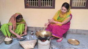 खरना के दिन व्रतियों द्वारा शाम में पूजा अर्चना के बाद गुड़ की खीर आदि प्रसाद का ग्रहण किया