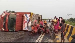 फोरलेन पर कंटेनर पलटने के बाद लगभग आधा घंटा तक सड़क जाम रहा
