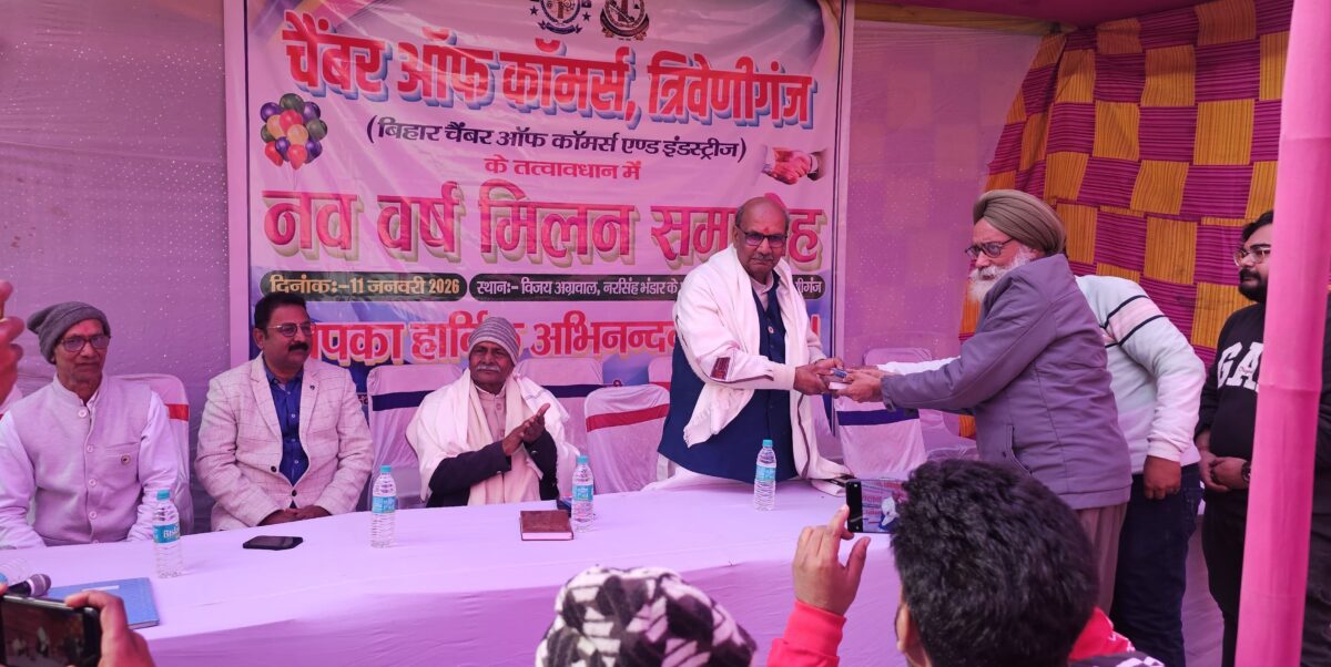 त्रिवेणीगंज. चैंबर ऑफ कॉमर्स द्वारा नव वर्ष मिलन समारोह का आयोजन रविवार को व्यवसायी विजय अग्रवाल के आवासीय परिसर में किया गया. कार्यक्रम की अध्यक्षता चैंबर ऑफ कॉमर्स के अध्यक्ष सज्जन कुमार संत ने की. समारोह में व्यापारियों के हितों की रक्षा के लिए संघर्ष का ऐलान किया गया. वक्ताओं ने एक स्वर में जीएसटी दरों में कमी, व्यापार को सरल बनाने की मांग व व्यापारियों को अनावश्यक रूप से तंग करने की व्यवस्था समाप्त करने पर जोर दिया. साथ ही व्यापारियों की सुरक्षा सुनिश्चित करने की मांग भी प्रमुख रूप से उठी. नव वर्ष में व्यापारिक एकता को और मजबूत करने तथा व्यापारियों के अधिकारों के लिए संगठित होकर संघर्ष करने का संकल्प लिया गया. इससे पूर्व आगत अतिथि और पत्रकारों को चादर, डायरी आदि से सम्मानित किया गया. समारोह में चैंबर ऑफ कॉमर्स सुपौल के अध्यक्ष धर्मेंद्र कुमार सिंह पप्पू, व्यापार संघ सुपौल अध्यक्ष अमर कुमार चौधरी, सचिव युगल किशोर अग्रवाल, महासचिव डॉ इंद्रभूषण प्रसाद, संतोष कुमार, नगर परिषद उपाध्यक्ष गीता देवी, मनीष अग्रवाल, शुभम चोखानी, विवेक केजरीवाल, रवि चोखानी, विपिन यादव, मनीष चोखानी, बोधि यादव, शैलेन्द्र यादव, सरदार हरभजन सिंह, राजकुमार भरतिया सहित बड़ी संख्या में व्यापारी एवं गणमान्य लोग उपस्थित रहे.