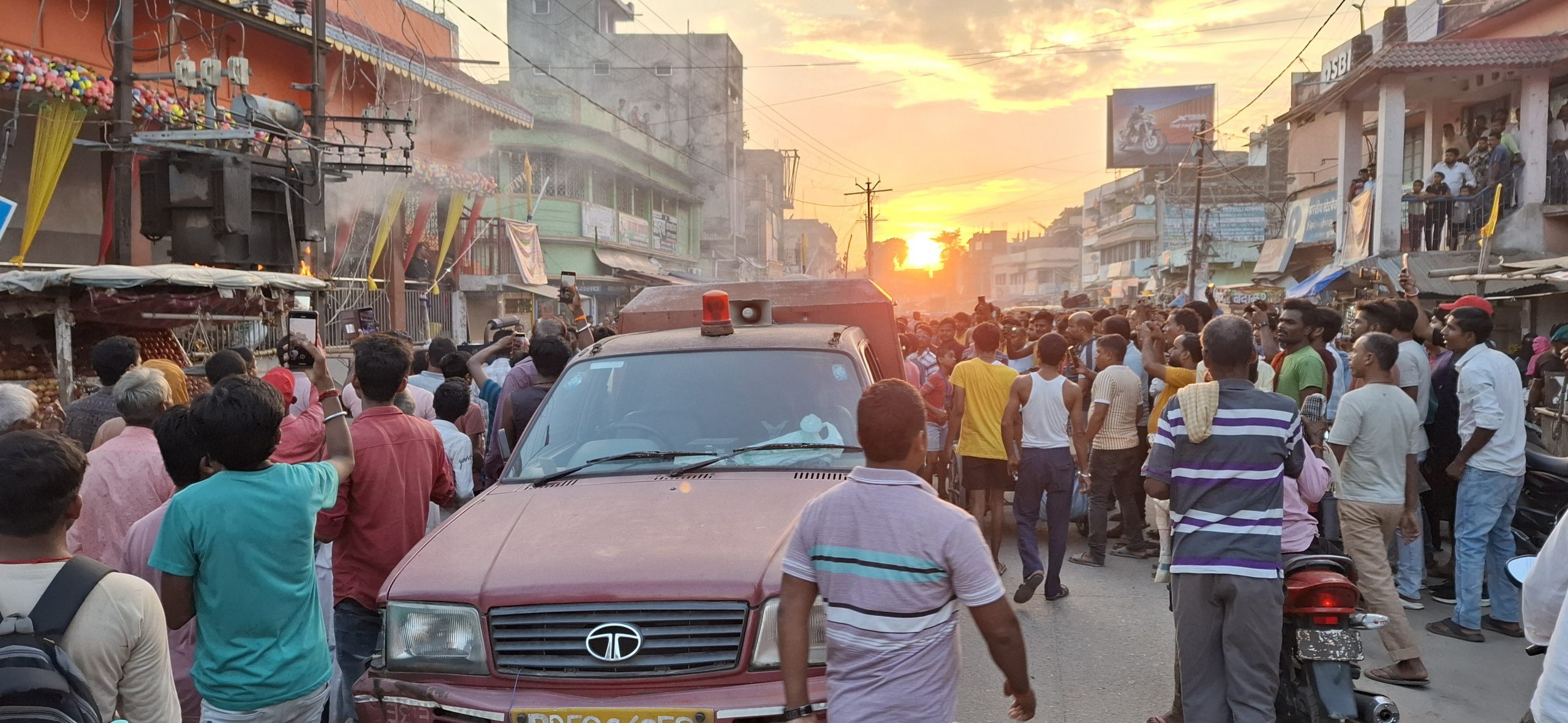 त्रिवेणीगंज गणेश महोत्सव के अवसर पर गांधी पार्क में बप्पा पूजा सेवा समिति द्वारा आयोजित सात दिवसीय श्रीमद्भागवत कथा के दौरान गुरुवार शाम एक बड़ी दुर्घटना होते-होते टल गई. शहर के बड़ी दुर्गा मंदिर के समीप स्थित ट्रांसफार्मर में अचानक भीषण आग लग गई, जिससे कथा स्थल और आसपास के इलाके में अफरा-तफरी मच गई. प्रत्यक्षदर्शियों के अनुसार, ट्रांसफार्मर में आग इतनी तेजी से भड़की कि कुछ ही मिनटों में विकराल रूप ले लिया. इसकी वजह से एनएच 327 ई पर गुजर रहे राहगीरों और कथा में शामिल श्रद्धालुओं में भगदड़ जैसी स्थिति बन गई. हालात को देखते हुए आयोजकों ने कुछ समय के लिए कथा कार्यक्रम को स्थगित कर दिया. स्थानीय लोगों ने आग बुझाने का प्रयास किया, लेकिन सफलता नहीं मिली. इसके बाद बिजली विभाग को सूचना दी गई और आपूर्ति तुरंत बंद कराई गई. तत्पश्चात अग्निशमन विभाग की टीम मौके पर पहुंची और काफी मशक्कत के बाद आग पर काबू पाया.
