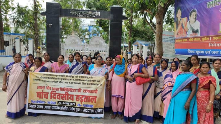 सात सूत्री मांगों को लेकर जिला प्रशासन को सौंपा ज्ञापन सुपौल. बिहार राज्य आशा कार्यकर्ता संघ (गोप गुट) और ऐक्टू के संयुक्त राज्यव्यापी आह्वान पर मंगलवार को सदर प्रखंड के पीएचसी परिसर में पांच दिवसीय हड़ताल शुरू किया गया. कार्यक्रम की अध्यक्षता जिला संयोजिका ऊषा सिंहा ने की. यह हड़ताल 20 से 24 मई तक जारी रहेगी. कार्यक्रम के दौरान आशा कार्यकर्ताओं ने अपनी सात सूत्री मांगों से संबंधित ज्ञापन सुपौल के जिलाधिकारी के माध्यम से मुख्यमंत्री, स्वास्थ्य मंत्री और स्वास्थ्य विभाग के प्रधान सचिव को सौंपा. राज्य सलाहकार कॉमरेड माधव प्रसाद सिंह, जिला अध्यक्ष विनोद कुमार, संयुक्त सचिव किशोर कुमार पाठक, ऐक्टू के जिला अध्यक्ष जितेंद्र कुमार चौधरी, जिला सचिव अरविंद कुमार शर्मा समेत आशा कार्यकर्ताओं ने आंदोलन को संबोधित किया. मौके पर सुजाता कुमारी, जयंती कुमारी, विनीता देवी, नीलम देवी, शमीमा खातून, अनीता कुमारी, ससिता कुमारी, मीरा देवी, ऊषा देवी, आशा देवी, चंद्रकला देवी, कोमल भारती, पिंकी देवी, कविता देवी, किरण देवी, नीतू कुमारी, स्नेहलता देवी, चंचल देवी, श्यामा देवी, नूतन झा, फूल कुमारी, रूना कुमारी, ममता कुमारी, ललिता कुमारी, मीणा कुमारी, सीमा कुमारी, स्वाहा प्रवीण, अंजू कुमारी, रेखा कुमारी, रीता कुमारी, सीता देवी और आरती कुमारी शामिल थी.
