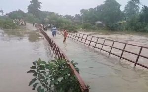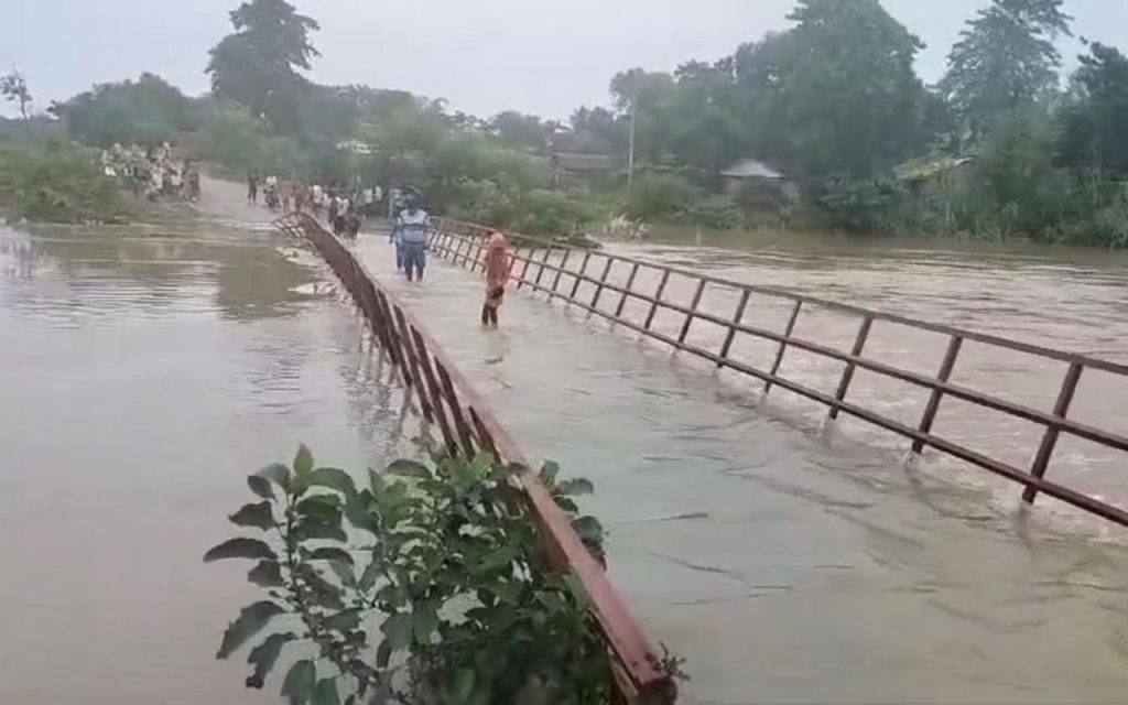 सुपौल जिला में भारी बारिश के कारण तिलयुगा नदी भी उफान पर है. तिलयुगा नदी का जलस्तर बढ़ने से अंतरराष्ट्रीय बॉर्डर को जोड़ने वाली निर्मली-कुनौली-नेपाल रोड पर डगमारा के पास लोहा पुल पर बाढ़ का पानी चढ़ गया है. पुल पर पानी के तेज बहाव के कारण लोग जान जोखिम में डालकर आवागमन करते दिख रहे हैं. यह स्थिति कम होने वाला नहीं हैं क्योंकि नेपाल में 36 घंटे भारी बारिश का अलर्ट जारी किया गया है.