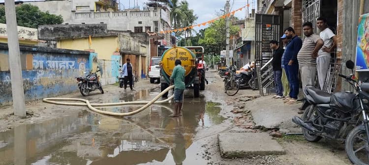 – शहर में जलजमाव से जनजीवन प्रभावित वीरपुर. बीती रात आई तेज आंधी और मूसलाधार बारिश ने वीरपुर, भीमनगर और आसपास के इलाकों में भारी तबाही मचा दी. अचानक बदले मौसम के तेवर से कई घरों के छप्पर उड़ गए, जबकि कई स्थानों पर बड़े-बड़े पेड़ टूटकर गिर पड़े, जिससे लोगों में दहशत का माहौल बना रहा. बुधवार शाम तेज गरज, आंधी-तूफान और बारिश के दौरान वीरपुर थाना के ठीक बगल में एक विशाल पेड़ गिर गया. गनीमत रही कि इस घटना में कोई बड़ा हादसा नहीं हुआ. इसके अलावा विभिन्न पूजा स्थलों पर लगाए गए स्वागत द्वार भी तेज आंधी की चपेट में आकर क्षतिग्रस्त हो गए. तेज बारिश के कारण नगर क्षेत्र में कई जगहों पर जलजमाव की गंभीर समस्या उत्पन्न हो गई, जिससे आम जनजीवन प्रभावित हुआ. सड़कों पर पानी भर जाने से आवागमन में लोगों को काफी परेशानी का सामना करना पड़ा. स्थिति को देखते हुए गुरुवार सुबह से ही नगर पंचायत हरकत में आई और सेफ्टी टैंक के माध्यम से जल निकासी का कार्य शुरू किया गया. मुख्य पार्षद सुशील कुमार ने बताया कि जिन क्षेत्रों में अधिक जलजमाव की समस्या है, वहां प्राथमिकता के आधार पर पानी निकाला जा रहा है, ताकि लोगों को आवाजाही में किसी तरह की दिक्कत न हो.