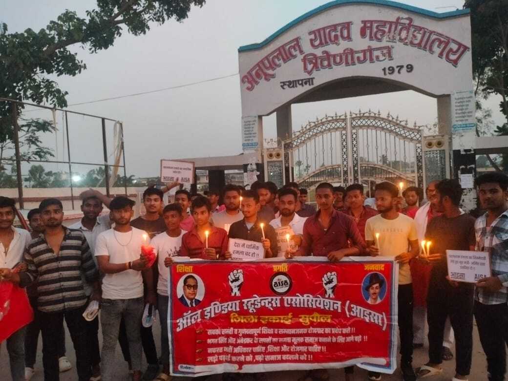 त्रिवेणीगंज. आइसा कार्यकर्ताओं ने गुरुवार की संध्या मुख्यालय स्थित अनूपलाल यादव महाविद्यालय के मुख्य द्वार से कैंडल जलाकर मेला ग्राउंड होते हुए पुरानी बैंक चौक पहुंचा. जहां उन्होंने पहलगाम हमले में मारे गए पर्यटकों को दो मिनट का मौन धारण का श्रद्धांजलि दी. प्रतिरोध सभा को संबोधित करते हुए आइसा जिलाध्यक्ष संतोष कुमार सियोटा ने कहा कि पहलगाम की बैसरन घाटी में सुरक्षा क्यों नहीं थी. वहां पर दो हज़ार लोग थे और वहां कोई सुरक्षा नहीं थी. इस चूक के लिए जिम्मेदार कौन है. आइसा जिला सचिव डॉ अमित चौधरी ने कहा कि पहलगाम में आतंकी हमला हुआ, जिसमें निर्दोष पर्यटक मारे गए हैं. प्रधानमंत्री नरेंद्र मोदी 56 इंच के सीना का बात करते हैं. लेकिन अब वह 56 इंच का सीना कहां गया है. जम्मू कश्मीर में आए दिन आतंकी हमले हो रहे हैं, आतंकवाद फिर से सिर उठा रहा है. आतंकवादी हमला का जवाबदेही तय होनी चाहिए. माले जिला सचिव जयनारायण यादव और खेगरामस जिला सचिव जन्मजय सिंह राई ने कहा कि देश की सुरक्षा के साथ खिलवाड़ हो रहा है. सरकार सिर्फ भाषणबाजी और जुमलेबाजी कर रही है. आतंकवाद को खत्म करने के उनके सारे दावे खोखले साबित हो रहे हैं. कहा कि आइसा और माले सरकार की इस विफलता पर गृह मंत्री अमित शाह के इस्तीफे की मांग करती है. प्रतिरोध मार्च में सुनील कुमार, अनुपम कुमार, शशिकांत कुमार, विवेक कुमार, मंजेश कुमार, राजू सिंह राई, अभिनंदन, छोटू कुमार, पप्पू कुमार, लालू कुमार, पिंटू कुमार, दिलखुश कुमार, दिलशाद आलम, शिव शंकर, कुमार, आद्रश कुमार, सावन, रौशन, अमित, सुनील, अभिनव, आनंद, विवेक, अरविंद, सचिन, नीतीश, कुणाल, पंकज, अवनीश, सोनू, अभिनव, रोहित, आनंद, लल्टू, कृष्णाशिव, गौरव, सत्यम, राजकिशोर, मंजीत, प्रवीण, संतोष, सुभाष, राजा, गौतम, प्रवेश, त्रिलोक, कपिल, हरिओम, सुमन, आशीष, पिंटू, अभिषेक, जयकुमार सहित दर्जनों कार्यकर्ता मौजूद थे.