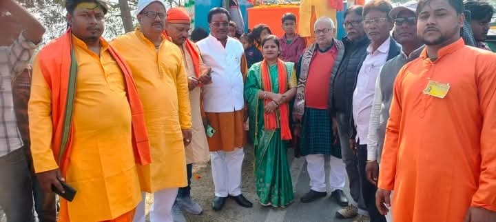 जदिया. भगवान रामलला के प्राण प्रतिष्ठा के प्रथम वर्षगांठ पर मानगंज पूर्वी हिंदू सेवा संगठन के तत्वावधान में शनिवार को जय श्रीराम के उद्घोष के साथ 501 के कन्याओं द्वारा कलश शोभा यात्रा निकाली गई. न्यू हनुमान मंदिर परिसर से निकली यह कलश शोभा यात्रा विभिन्न मार्गों होते हुए कोरियापट्टी स्थित सुरसर नदी पहुंची. सुरसर नदी का पवित्र जल कलश में भरकर पुनः हनुमान मंदिर पहुंची. जहां कलश शोभा यात्रा का समापन किया गया. शोभा यात्रा समापन के बाद अखंड संकीर्तन का शुभारंभ हुआ. इस दौरान जय श्रीराम के जयघोष से माहौल भक्तिमय बना रहा. शोभा यात्रा में भाजपा जिलाध्यक्ष नरेंद्र ऋषिदेव, जिप सदस्या पूनम कुमारी, पवन कुमार अग्रवाल, भूषण दिवाकर, मोहन सिंह, कमल ठाकुर, उमेश कुमार मेहता, रूपेश कुमार, मिंटू कुमार, राहुल राज, प्रणव कुमार, राकेश कुमार, सुशील कुमार, विपिन कुमार, महेश कुमार, सुधीर कुमार, शशिभूषण कुमार सिन्हा, कृष्णदेव मेहता, अरुण कुमार आदि शामिल थे.