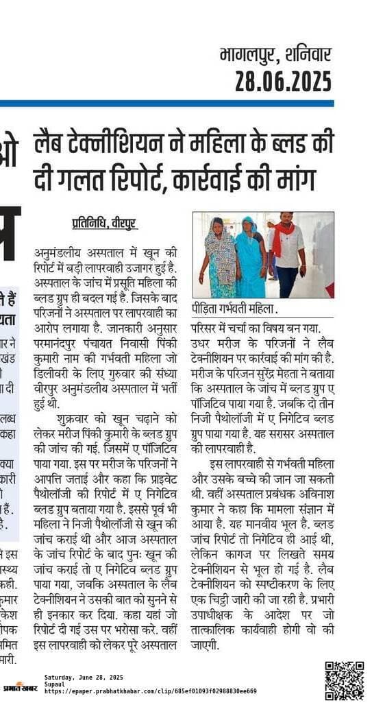 वीरपुर. बीते शनिवार को अनुमंडलीय अस्पताल में ब्लड की रिपोर्ट में बड़ी लापरवाही उजागर हुई थी. जहां प्रसूति महिला का ब्लड ग्रुप अस्पताल के जांच में बदल गया, जिसके बाद परिजनों ने अस्पताल पर लापरवाही का आरोप लगाया था. प्रभात खबर में समाचार प्रकाशित होने के 24 घंटे के अंदर ही लैब टेक्नीशियन पर कार्रवाई हुई. उसे निलंबित कर दिया गया. जानकारी अनुसार परमानंदपुर पंचायत निवासी 23 वर्षीय पिंकी कुमारी नाम की गर्भवती महिला जो डिलीवरी के गुरुवार की संध्या वीरपुर अनुमंडलीय अस्पताल में भर्ती हुई थी. शुक्रवार को खून चढ़ाने को लेकर मरीज़ पिंकी कुमारी के ब्लड ग्रुप की जांच की गई, जिसमें ए पॉजिटिव पाया गया. इस पर मरीज के परिजनों ने आपत्ति जताई. कहा कि प्राइवेट पैथोलॉजी की रिपोर्ट में ए निगेटिव ब्लड ग्रुप बताया गया है. परिजनों ने लैब टेक्नीशियन पर कार्रवाई की मांग की. सोमवार को सीएस ललन ठाकुर ने पत्र जारी उक्त लैब टेक्नीशियन पर कार्रवाई करते हुए उसे निलंबित कर दिया है. जारी पत्र में लिखा गया है कि वीरपुर अनुमंडलीय अस्पताल में प्रयोगशाला प्रावैधिक पद पर कार्यरत मो आसिफ हुसैन ने ईलाज हेतु अस्पताल आई परमानंदपुर पंचायत की 23 वर्षीय पिंकी देवी की ब्लड ग्रुप जांच की थी. जांच परिणाम ए निगेटिव पाया गया. लेकिन जांच परिणाम ए पॉजिटिव दिया गया. इनका यह कृत्य इनके कार्य के प्रति घोर लापरवाही को प्रदर्शित करता है.