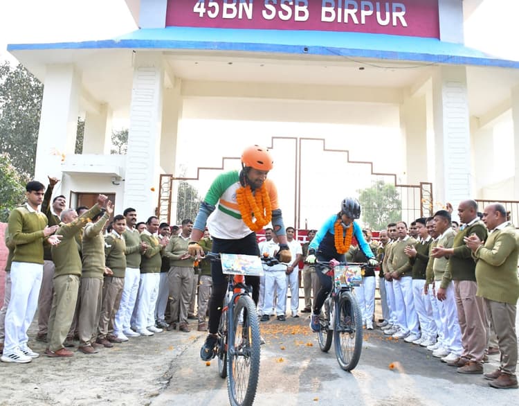 वीरपुर एसएसबी 45वीं बटालियन के कार्य क्षेत्र से होकर मिजोरम जाने वाली साइकिलिस्ट सबिता मेहता एवं शुभम पारखी को सोमवार की शाम प्रोत्साहित किया गया. इस दौरान दोनों साइकिलिस्ट ने अपना अनुभव जवानों के साथ साझा किया तथा एसएसबी का मार्गदर्शन के लिए आभार व्यक्त किया. दोनों ही साइकिलिस्ट ने अपनी यात्रा गुजरात के कच्छ से शुरू की थी तथा अप्रैल माह के अंत तक 11 राज्यों से होते हुए मिजोरम पहुंचने का लक्ष्य है. उक्त दोनों ही साईकलिस्ट ने बताया कि इस यात्रा का मुख्य उद्देश्य महिला सशक्तिकरण है. पूर्व में भी साइकिलिस्ट सबिता महतो ने विश्व की सबसे ऊंची सड़क (जो की समुद्र तट से 19420 फीट की ऊंचाई पर स्थित है) पर 570 किलोमीटर दौड़ लगाकर इतिहास रच चुकी है. इस दौरान 45 वी बटालियन के कमाडेंट गौरव सिंह, द्वितीय कमान पदाधिकारी जगदीश शर्मा व अन्य अधिकारी गण, अधीनस्थ अधिकारी गण तथा जवान उपस्थित थे.