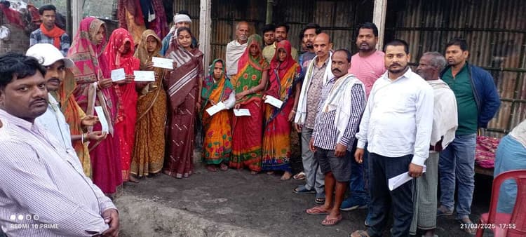 जदिया. जदिया पंचायत के फुलकाहा वार्ड नंबर 20 में शुक्रवार को जदिया पंचायत के मुखिया अनु अग्रवाल द्वारा अग्निपीड़ितों के बीच सरकारी सहायता राशि उपलब्ध कराया गया. मुखिया अनु अग्रवाल ने बताया सभी 07 अग्निपीड़ित परिवार को अंचलाधिकारी से प्राप्त 12 हजार रुपए का अलग -अलग चेक व पालीथीन शीट अग्निपीड़ितों के बीच वितरण किया गया. बता दे कि बीते दिनों फुलकाहा वार्ड नंबर 20 में बिजली के शाट-सर्किट होने के कारण आग लग गयी थी. जिसमें सात परिवार के घर सहित घर में रखे सभी सामान जलकर राख हो गया था. जिससे पीड़ित परिवार खुले आसमान के नीचे जीने को विवश हो गया था. हालांकि गांव के नौजवानों ने चंदा इकट्ठा कर सभी अग्निपीड़ित परिवारों को एक -एक चदरे का घर बनवाकर मिसाल कायम किया. इस मौके पर जदयू व्यवसायिक एवं उधोग प्रकोष्ठ के प्रदेश उपाध्यक्ष संजय अग्रवाल, उमेश प्रसाद यादव, फुलेश्वर मेहता, अनिल मेहता, सुभाष यादव, दीपक यादव, गौतम यादव, जितेंद्र यादव आदि मौजूद थे.