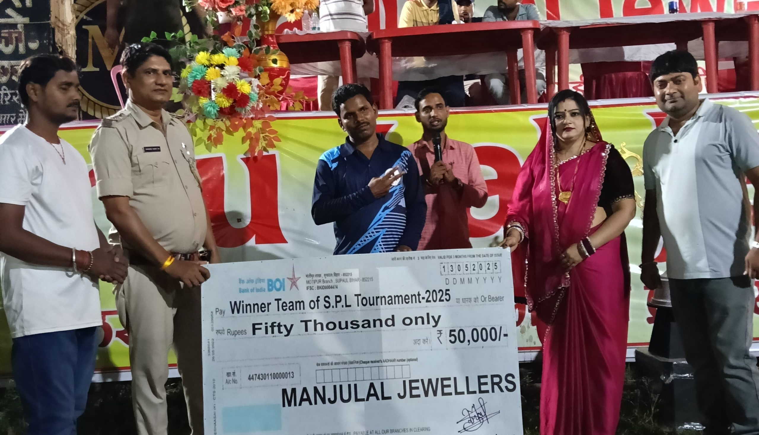 राघोपुर. लखीचंद साहू उच्च विद्यालय के मैदान में पांच मई से चल रहे सिमराही प्रीमियम लीग क्रिकेट टूर्नामेंट 2025 का समापन धूमधाम और रोमांच के साथ हुआ. टूर्नामेंट के फाइनल मुकाबले में सतीश संजीवनी हॉस्पिटल एलेवन ने श्री राम एलेवन को करारी शिकस्त देते हुए खिताब अपने नाम किया. फाइनल मैच में टॉस जीतकर सतीश संजीवनी हॉस्पिटल एलेवन के कप्तान सतीश यादव ने पहले बल्लेबाजी करने का निर्णय लिया और शुरुआत से ही आक्रामक तेवर दिखाते हुए रनों की बारिश कर दी. टीम ने निर्धारित 20 ओवर में 05 विकेट के नुकसान पर 277 रन का विशाल स्कोर खड़ा कर दिया, जो टूर्नामेंट का अब तक का सर्वोच्च स्कोर रहा. टीम की ओर से अनुभव सिंह राजपूत ने एक यादगार और ऐतिहासिक पारी खेलते हुए महज 62 गेंदों पर नाबाद 139 रन बनाए. उन्होंने अपनी पारी में 3 चौके और 20 गगनचुंबी छक्के जड़े और लगभग 225 के स्ट्राइक रेट से बल्लेबाजी की. वहीं सरफराज बाहुबली ने 30 गेंदों में 1 चौका और 6 छक्कों की मदद से 45 रन बनाए. दोनों के बीच 128 रनों की ताबड़तोड़ साझेदारी ने टीम को मजबूत स्थिति में पहुंचा दिया. पारी के अंत में बिट्टू यादव ने मात्र 12 गेंदों में 7 छक्के जड़कर 43 रन तथा सुप्रीम ने 9 गेंदों पर तेजतर्रार 35 रन बनाकर स्कोर को 277 तक पहुंचा दिया. लक्ष्य का पीछा करने उतरे श्रीराम एलेवन के कप्तान मुकेश कुमार यादव के नेतृत्व में टीम शुरुआत से ही दबाव में नजर आई. बल्लेबाजों के लगातार विकेट गिरते रहे और पूरी टीम निर्धारित 20 ओवरों में 163 रन बनाकर सिमट गई. टीम की ओर से राजा खान मालदा ने सर्वाधिक 46 रनों की पारी खेली, लेकिन वह भी टीम को जीत नहीं दिला सके. सतीश संजीवनी की गेंदबाजी भी शानदार रही. सुप्रीम ने 3 विकेट झटके, जबकि तुषार ने 2 विकेट लेकर विपक्षी टीम की कमर तोड़ दी. मैच के समापन पर एसआई जैनेंद्र कुमार झा एवं मंजू लाल ग्रुप के मैनेजिंग डायरेक्टर सोनी स्वर्णकार ने संयुक्त रूप से विजेता टीम को कप और 50,000 रुपये का चेक प्रदान कर सम्मानित किया. वहीं उपविजेता टीम को कप और 21,000 रुपये की राशि देकर सम्मानित किया गया. अनुभव सिंह राजपूत को उनके शानदार शतक के लिए मैन ऑफ द मैच और अशफाक को बेहतरीन ऑलराउंड प्रदर्शन के लिए प्लेयर ऑफ द टूर्नामेंट घोषित किया गया. इस ऐतिहासिक क्रिकेट टूर्नामेंट को देखने के लिए क्षेत्र के दर्जनों गणमान्य लोग और हजारों की संख्या में दर्शक रात भर मैदान में मौजूद रहे. मुख्य अतिथियों में भपटियाही के प्रखंड प्रमुख विजय कुमार यादव, मुखिया सतीश पांडेय, टुनटुन यादव, लाल जी स्वर्णकार, बैद्यनाथ भगत, बैद्यनाथ यादव, ललित जायसवाल, राधेश्याम भगत, दिलीप पूर्वे, उमेश गुप्ता, प्रमोद साह, बाली यादव सहित कई अन्य सम्माननीय व्यक्ति शामिल थे. इस टूर्नामेंट ने क्षेत्र में खेल भावना, युवा प्रतिभाओं को मं