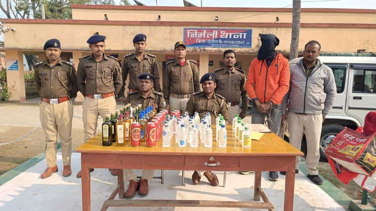 निर्मली. थानाध्यक्ष सियावर मंडल के नेतृत्व में पुलिस ने नगर पंचायत निर्मली वार्ड नंबर 08 स्थित एक आवासीय घर से अलग-अलग ब्रांड के 84 बोतल शराब के साथ एक तस्कर को गिरफ्तार किया गया. थानाध्यक्ष श्री मंडल ने बताया कि पुलिस को गुप्त सूचना मिली कि नगर पंचायत निर्मली वार्ड नंबर 08 निवासी शंभू कुमार साह के घर से भारी मात्रा में शराब की तस्करी की जा रही है. सूचना मिलते ही पुलिस उक्त स्थल पर पहुंचा तो देखा कि दो युवक अपने ही घर से शराब की तस्करी कर रहा है. पुलिस ने उसके घर में छापेमारी कर अलग-अलग ब्रांड के कुल 84 बोतल देसी एवं विदेशी शराब बरामद किया. वहीं पुलिस को देखते ही घनी आबादी का फायदा उठाकर गृहस्वामी शंभू साह फरार हो गया. घर में एक डिलेवरी बॉय किशनपुर थाना क्षेत्र के परसामाधो गांव निवासी परमेश्वर साह को पुलिस ने गिरफ्तार कर लिया. उसके पास से उपयोगी एक बाइक एवं एक आईफोन भी जब्त किया गया है. उन्होंने बताया कि दो तस्कर के खिलाफ केस दर्ज करते हुए गिरफ्तार तस्कर को जेल भेज दिया गया है.