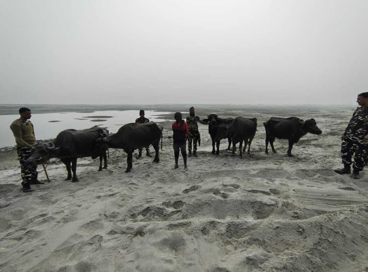 कुनौली. एसएसबी 45वीं बटालियन सीमा चौकी कुनौली की विशेष गश्ती टीम ने नेपाल से भारत लाये जा रहे मवेशियों के साथ एक व्यक्ति को गिरफ्तार किया. 45वीं बटालियन के कमांडेंट गौरव सिंह ने बताया कि कोशी स्पर संख्या 08 बथनाहा नोज के निकटवर्ती क्षेत्र से नेपाल प्रभाग से भारत में मवेशियों की तस्करी की सूचना मिली थी. जिस सूचना के आलोक में तस्करों को पकड़ने लिए सहायक उप-निरीक्षक संत राम के नेतृत्व में एक विशेष गश्ती दल का गठन किया गया. वहीं गठित दल ने तस्कर को मवेशियों के साथ धर दबोचने में कामयाबी हासिल की. दूसरी ओर उस व्यक्ति से संबंधित कागजात दिखाने को कहा गया. लेकिन उस व्यक्ति के पास मवेशियों को नेपाल से भारत लाने के कोई भी वैध दस्तावेज़ नहीं था. जिस कारण गश्ती दल द्वारा सभी मवेशियों को अपने कब्जे में लिया गया. तत्पश्चात उचित कागजी कार्यवाही के बाद सभी मवेशियों को जब्त कर कमलदहा फाटक कुनौली तथा हिरासत में लिए गए व्यक्ति व उसके पास से बरामद मोबाइल को कुनौली थाना के सुपुर्द कर दिया गया. तस्कर की पहचान कमलपुर वार्ड नंबर 05 निवासी 34 वर्षीय रविंदर यादव के रूप में की गई.