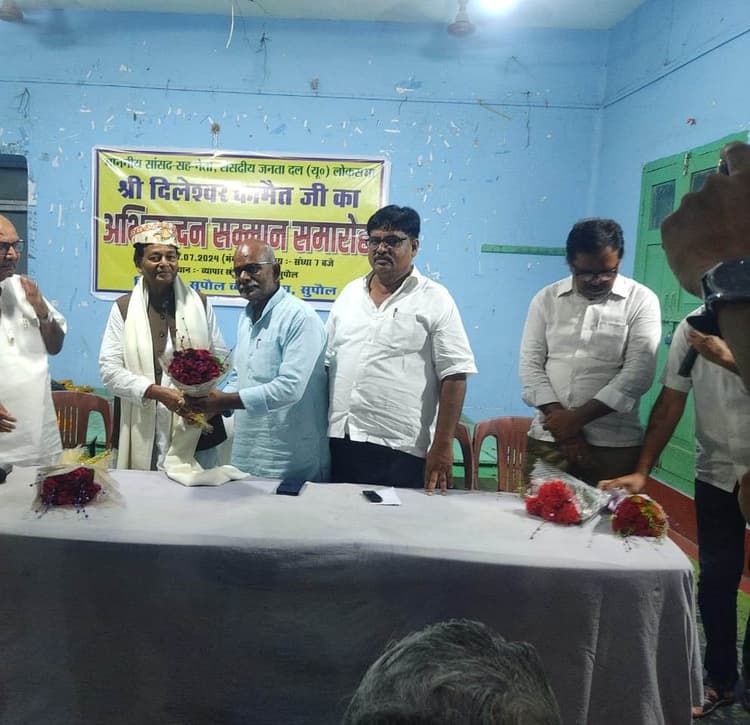 सुपौल. सांसद दिलेश्वर कामैत का अभिनंदन समारोह मंगलवार को व्यापार संघ सुपौल द्वारा व्यापार संघ भवन में किया गया. यह समारोह दिलेश्वर कामैत के दूसरी बार सांसद के रूप में निर्वाचित होने एवं जदयू संसदीय दल के नेता के रूप में चयन होने पर आयोजित किया गया. इस अवसर पर श्री कामैत का भव्य स्वागत शहर के व्यापारियों द्वारा किया गया. व्यापार संघ के अध्यक्ष अमर कुमार चौधरी एवं सचिव युगल किशोर अग्रवाल के द्वारा सांसद को पाॅग एवं अंगवस्त्र देकर सम्मानित किया गया. संघ के कार्यकारिणी सदस्य एवं व्यापारियों द्वारा बुके देकर स्वागत किया. मौके पर बड़ी संख्या में संघ के सदस्य एवं शहर के व्यापारी मौजूद थे. इस अवसर पर सुशील कुमार चौधरी, संतोष प्रधान, राम कुमार चौधरी, रमेश कुमार मिश्रा, गोविंद प्रसाद अग्रवाल, डॉ सुब्रत मुखर्जी, राम अवतार गुप्ता, जगन्नाथ चौधरी, मातादीन अग्रवाल, देवनारायण चौधरी, विनोद जैन, रौशनलाल जैन, योगेंद्र प्रसाद साह, भगवानदत चौधरी, बंटी मिश्रा, ओम प्रकाश गुप्ता, बच्चा लाल चौधरी, अशोक चौधरी, इरफानुल हौदा, सुभाष राय, बच्चा लाल चौधरी, संतोष मंडल, संजय कुमार समेत शहर के अन्य व्यवसायी व आमलोग मौजूद थे.