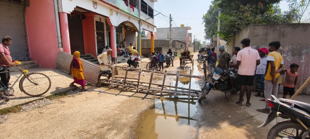 शौचालय टैंक का पानी रास्ते पर आने से लोग परेशान, किया सड़क जाम