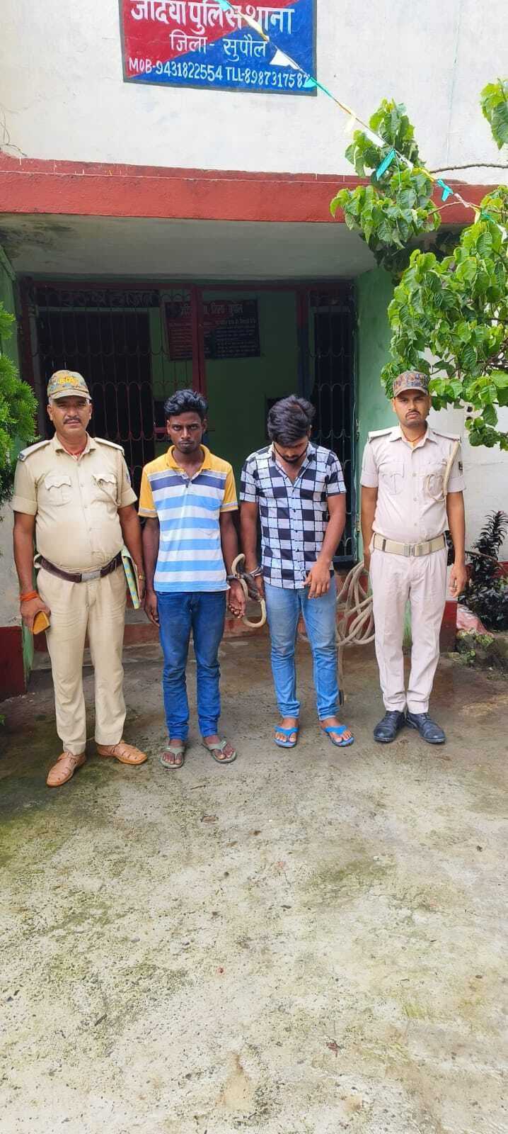 जदिया. जदिया पुलिस ने गुरुवार को मिलन चौक के समीप वाहन चेकिंग के दौरान दो युवकों को गिरफ्तार किया. गिरफ्तार दोनों युवक के पास से पुलिस ने छह कारतूस बरामद किया. थानाध्यक्ष राजीव कुमार ने बताया कि वाहन चैकिंग के दौरान मिलन चौक के समीप एक बाइक पर सवार दो युवक आ रहा था. वाहन चैकिंग होता देख बाइक सवार दोनों युवक भागने का प्रयास किया. लेकिन पुलिस के जवानों ने उसे खदेड़कर पकड़ लिया. तलाशी के दौरान युवक के पेंट की जेब से छह जिंदा कारतूस बरामद हुआ. पूछताछ में गिरफ्तार युवकों की पहचान भैयाराम विशनपुर निवासी श्रीलाल यादव का पुत्र सतीश कुमार और दूसरा राजेश्वरी थाना क्षेत्र के तमुआ निवासी तारनी यादव का पुत्र संतन कुमार के रूप में हुई है. थानाध्यक्ष ने बताया कि कांड संख्या 119/24 दर्ज आरोपित को न्यायिक हिरासत में सुपौल भेज दिया गया.
