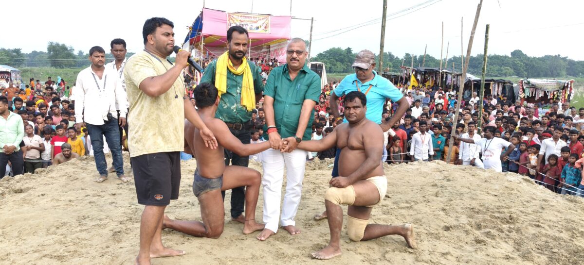 निर्मली. अनुमंडल क्षेत्र के मरौना प्रखंड अंतर्गत ललमनियां पंचायत स्थित मुसहरी चौक के पास जितिया पर्व के शुभ अवसर पर गांव में भव्य मेले का आयोजन किया गया. जिसमें पारंपरिक कुश्ती प्रतियोगिता मुख्य आकर्षण रही. दूर-दराज से पहलवानों ने भाग लिया और अपने दमखम का प्रदर्शन किया. कुश्ती देखने के लिए क्षेत्र सहित स्थानीय ग्रामीणों की भारी भीड़ उमड़ी. बच्चों और महिलाओं में काफी उत्साह देखने को मिला. इस आयोजन में गनौरा पंचायत के मुखिया जितेंद्र कुमार भी विशेष रूप से उपस्थित हुए. पहलवानों का हौसला बढ़ाया. उन्होंने मेले की व्यवस्था और सांस्कृतिक कार्यक्रमों की सराहना करते हुए कहा कि ऐसे आयोजन समाज को एकजुट करते हैं. हमारी परंपराओं को जीवित रखते हैं.
