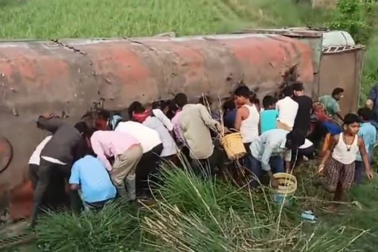 टैंकर के पलटने के बाद बाल्टी, डिब्बा लेकर पहुंचे ग्रामीण