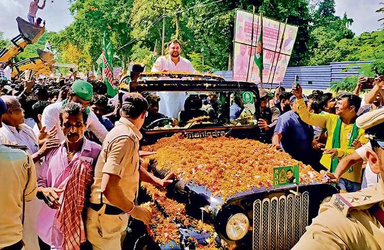 Tejashwi Yadav Photos: रास्ते में जहां एक ओर हजारों की संख्या में प्रमंडल की आंगनबाड़ी सेविका अपनी मांगों को लेकर कतारबद्ध होकर मांग कर रही थी. वहीं दूसरी तरफ दर्जनों जेसीबी में उपर चढ़कर उत्साहित युवा उनपर फूल बरसाते रहे.