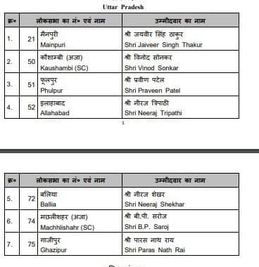 लखनऊ: बीजेपी ने यूपी की 8 लोकसभा सीटों (BJP Candidate List 2024) से प्रत्याशी घोषित किए हैं. मैनपुर से मैनपुरी से जयवीर सिंह ठाकुर, कौशांबी (सु) से विनोद सोनकर, फूलपुर से प्रवीण पटेल, इलाहाबाद से नीरज त्रिपाठी, बलिया से नीरज शेखर, मछलीशहर (सु) बीपी सरोज, गाजीपुर से पारस नाथ राय को चुनाव मैदान में उतारा गया है. इलाहाबाद से रीता बहुगुणा का टिकट कटा है, उनकी जगह केशरी नाथ त्रिपाठी के बेटे नीरज त्रिपाठी को टिकट दिया गया है. वहीं बलिया से पूर्व प्रधानमंत्री चंद्रशेखर के बेटे नीरज शेखर मैदान में हैं.