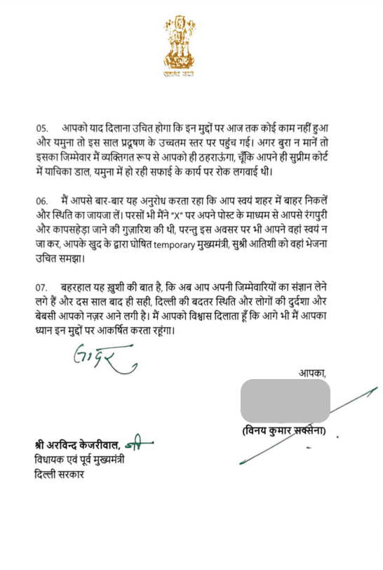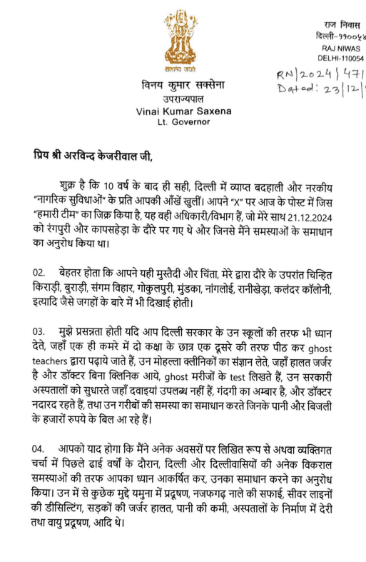 दिल्ली के एलजी ने अपने पत्र में लिखा कि ‘ बेहतर होता कि आपने यही मुस्तैदी और चिंता, मेरे द्वारा दौरे के उपरांत चिन्हित किराड़ी, बुराड़ी, संगम विहार, गोकुलपुरी, मुंडका, नांगलोई, रानी खेड़ा, कलंदर कॉलोनी जैसे जगहों के बारे में भी दिखाई होती. मुझे प्रसन्नता होती अगर आप दिल्ली सरकार के उन स्कूलों की तरफ भी ध्यान देते, जहां एक ही कमरे में दो कक्षा के छात्र एक दूसरे की तरफ पीठ कर ghost teachers द्वारा पढ़ाये जाते हैं, उन मोहल्ला क्लीनिकों का संज्ञान लेते, जहां हालत जर्जर है और डॉक्टर बिना क्लिनिक आए, ghost मरीजों के test लिखते हैं, उन सरकारी अस्पतालों को सुधारते जहां दवाइयां उपलब्ध नहीं है, गंदगी का अंबार है और डॉक्टर नदारद रहते हैं और उन गरीबों की समस्या का समाधान करते जिनके पानी और बिजली के हजारों रुपये के बिल आ रहे हैं.