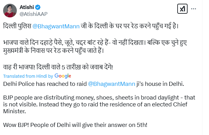 Delhi Police Raid: दिल्ली विधानसभा चुनाव से पहले सियासत गरमाई हुई है. इसी कड़ी में दिल्ली की सीएम आतिशी ने दावा किया है कि पंजाब के सीएम भगवंत मान के आवास पर दिल्ली पुलिस रेड करने पहुंची है. सीएम आतिशी ने अपने सोशल मीडिया हैंडल एक्स पर पोस्ट करते हुए लिखा कि पंजाब के सीएम भगवंत मान के दिल्ली स्थित आवास पर दिल्ली पुलिस रेड करने पहुंची है. “दिल्ली पुलिस भगवंत मान के दिल्ली के घर पर रेड करने पहुंच गई है. भाजपा वाले दिन दहाड़े पैसे, जूते, चद्दर बांट रहे हैं वो नहीं दिखता. बल्कि एक चुने हुए मुख्यमंत्री के निवास पर रेड करने पहुंच जाते हैं. वाह री भाजपा! दिल्ली वाले 5 तारीख को जवाब देंगे!”.