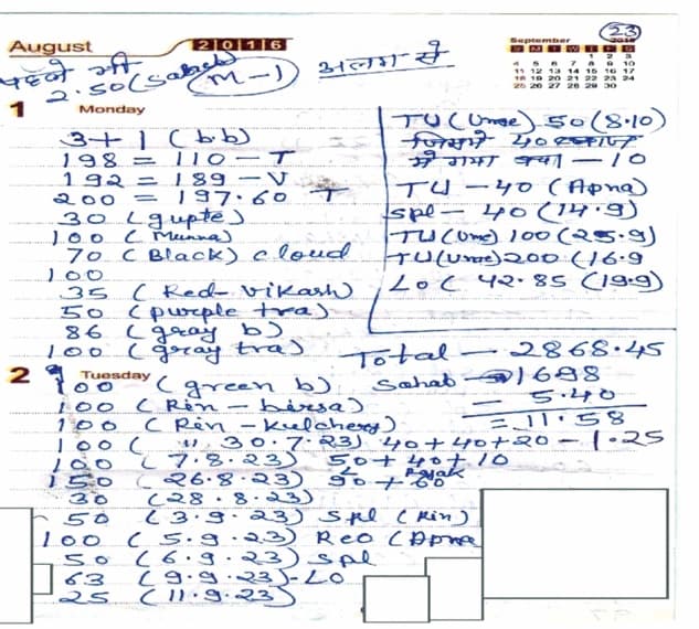 डायरी के पन्ने में रुपयों से भरे बैग का रंग और उसे लानेवाले का नाम दर्ज