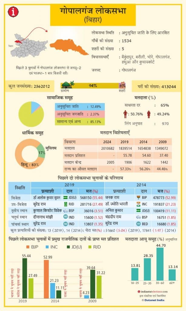 गोपालगंज सीट 2009 से प्रभावी नए परिसीमन में सुरक्षित हुई और उसके बाद से राजग का ही इस सीट पर कब्जा है. जब 2014 में भाजपा और जदयू अलग-अलग चुनाव लड़े तब यहां से भाजपा प्रत्याशी जनक राम जीते. वहीं 2019 में सीट जदयू के पास गयी तो डॉं आलोक कुमार सुमन एनडीए की ओर से जीते. जदयू ने उन्हें ही फिर एकबार टिकट थमाया है. महागठबंधन में यह सीट मुकेश सहनी की पार्टी वीआइपी के खाते में गयी है. प्रेमनाथ चंचल वीआई की ओर से महागठबंधन के उम्मीदवार हैं.