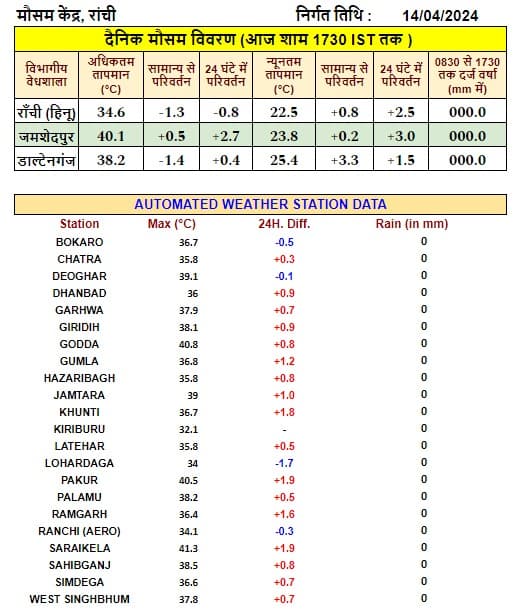 - जमशेदपुर का उच्चतम तापमान 40.1 डिग्री सेंटीग्रेड