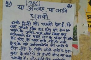 शरारती तत्वों ने पोस्टर में धार्मिक प्रतीकों का भी प्रयोग किया है और इसे हिंदी में लिखा गया है. पोस्टर में लिखा है कि मैं सभी हिंदी को धमकी देता हूं कि वह गांव छोड़ कर एक महीने के अंदर भाग जायें. पोस्टर में एक खास समुदाय को भाग जाने की धमकी दी गयी है और कहा है कि ऐसा नहीं करने पर उनको बक्शा नहीं जायेगा. पोस्टर में लव जेहाद का जिक्र किया गया है.