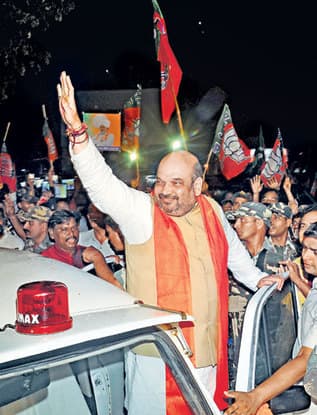 राष्ट्रीय अध्यक्ष अमित शाह ने भाजपा कार्यकर्ताओं का अभिवादन किया. शाम 7.57 बजे श्री शाह बिरसा चौक पहुंचे. उन्होंने गाड़ी के फुट रेस्ट पर खड़ा होकर कार्यकर्ताओं का अभिवादन किया.