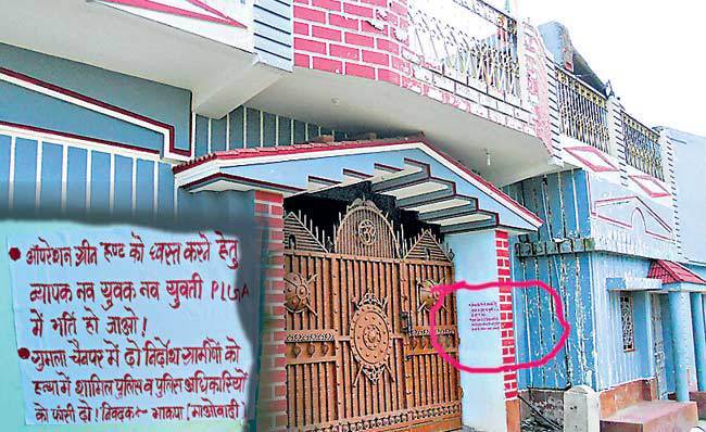 गुमला चैनपुर में दो ग्रामीणों की हत्या में शामिल पुलिस व पदाधिकारियों को फांसी देने की मांग की गयी है. टुनिया में विधायक के पुराने आवास के मुख्य द्वार पर भी भाकपा माओवादियों ने पोस्टर चिपका कर बंद का आह्वान किया. हालांकि पोस्टर साटे जाने की खबर के बाद सुबह करीब सात बजे सोनुवा पुलिस टुनिया गांव पहुंची और सभी पोस्टरों को उखाड़ कर साथ ले गयी.