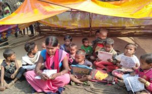 उग्रवाद प्रभावित धमधरवा में पेड़ के नीचे तिरपाल की छत के अंदर बैठ क, ख, ग सीख रहे नौनिहाल
