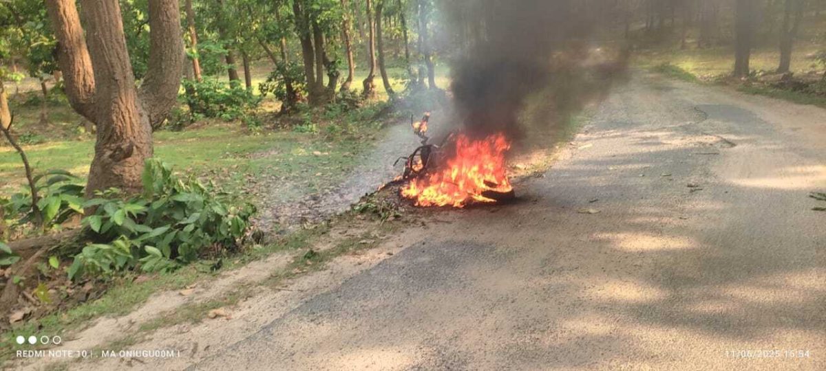 Bokaro News : चतरोचटी थाना क्षेत्र अंतर्गत कर्रीखुर्द पंचायत के बासोवार और कर्री जंगल के बीच सड़क में चलती बाइक में अचानक आग लग गयी.