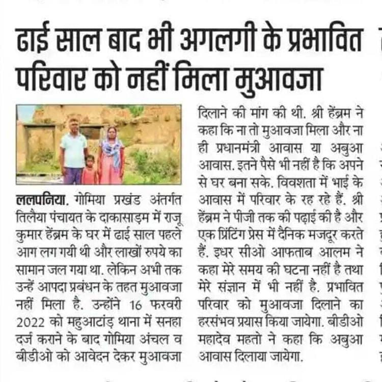 ललपनिया, गोमिया प्रखंड अंतर्गत तिलैया पंचायत के दाकासाड़म में राजू कुमार हेंब्रम के घर में आग लग गयी थी और लाखों रुपये का सामान जल गया था. ढाई साल बाद भी उन्हें मुआवजा नहीं मिलने संबंधी समाचार प्रभात खबर में छपने के बाद बीडीओ व सीओ ने मामले पर संज्ञान लिया है. बीडीओ महादेव कुमार महतो व सीओ आफताब आलम ने मंगलवार को राजू कुमार हेंब्रम को बुला कर मामले की जानकारी ली. मुआवजा और आवास दिलाने के लिए कार्रवाई करने की बात कही. आवेदन करने के बाद भी मुआवजा नहीं मिलने की जांच सीओ ने की. बीडीओ ने कहा कि उन्हें प्रधानमंत्री आवास मुहैया कराने के लिए पहल की जायेगी.