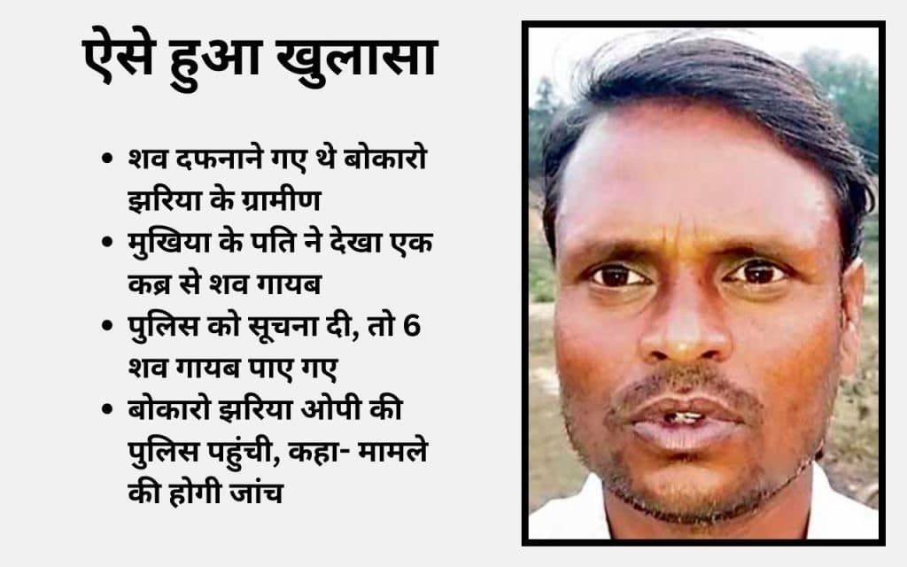 बोकारो झरिया ओपी के अधिकारी पहुंचे और पाया कि 6 शव गायब हैं. ओपी प्रभारी ने कहा कि पिछले दिनों अनु कुमारी, लाला भुईयां और महपतिया देवी के शवों को यहां दफनाया गया था. उनके शव भी गायब हैं.