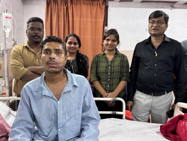 जैसे ही मरीज को कैजुअल्टी में लाया गया, डॉक्टरों ने बिना एक पल गंवाये रिससिटैशन शुरू किया. खून लगातार बह रहा था, सांसें थमने को थीं. लेकिन डॉक्टरों की टीम डॉ अनिंदा मंडल के नेतृत्व में डटी रही. मरीज को तुरंत ऑपरेशन थियेटर में ले जाया गया, जहां डॉ सतीश के मार्गदर्शन में जनरल सर्जन डॉ अखिलेश व उनकी टीम ने सात घंटे तक ऑपरेशन कर खून बहना रोका. इस दौरान मरीज की नाक व मुंह से सांस लेना असंभव हो चुका था. इसलिए डॉ. बृजेश के नेतृत्व में इएनटी टीम ने ट्रेकियोस्टोमी (गले में सांस लेने का वैकल्पिक मार्ग) बनाकर उसे सांस दी.छह मार्च को टीम ने की प्लास्टिक सर्जरी