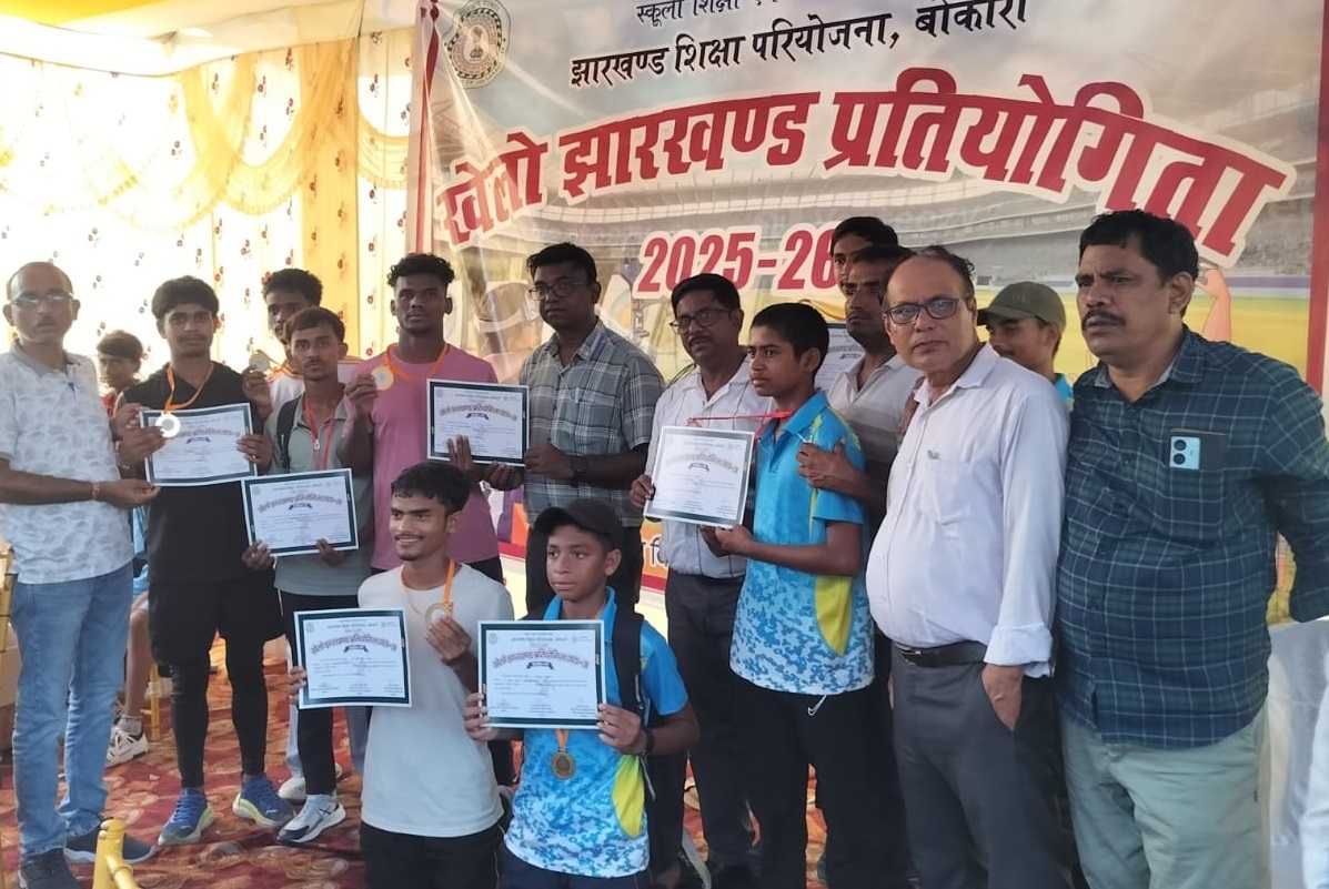 चंदनकियारी, चंदनकियारी स्टेडियम में आयोजित दो दिवसीय खेलो झारखंड-2025 का मंगलवार को समापन हुआ. चंदनकियारी प्लस 2 उच्च विद्यालय के विद्यार्थियों ने 15 इवेंट में 15 गोल्ड मेडल जीत कर नया कीर्तिमान बनाया है. वहीं विद्यालय में नाम एक ब्रांज व दो सिल्वर मेडल भी शामिल है. अंतिम दिन मुख्य रूप से एथलेटिक्स बालक वर्ग में अंडर 14, अंडर 17 व अंडर 19 में 100, 400, 200 व 1500 मीटर दौड़, तीरंदाजी व अन्य विभिन्न खेल प्रतियोगिताएं आयोजित हुई. इसमें प्रथम, द्वितीय व तृतीय स्थान प्राप्त करने वाले बालक प्रतिभागियों को मेडल एवं प्रशस्ति पत्र देकर सम्मानित किया. बोकारो जिला के विभिन्न प्रखंड से प्रथम स्थान प्राप्त करने वाले बालक इस खेल में प्रतिभागी थे. अंडर 14 आयु वर्ग में 100 मीटर दौड़ प्रतियोगिता में चास के प्रथम स्थान रूपेश कुमार, अंडर 17, 100 मीटर दौड़ में प्रथम स्थान बेरमो के बैधनाथ राम, अंडर 19, 100 मीटर दौड़ में प्रथम स्थान चंदनकियारी के साजिद को प्राप्त हुआ, इसके अलावा विभिन्न आयु वर्ग के विभिन्न प्रतियोगिताओं में प्रथम स्थान पाने वाले प्रतिभागी राज्य स्तरीय खेलो झारखंड प्रतियोगिता में भाग लेंगे.
