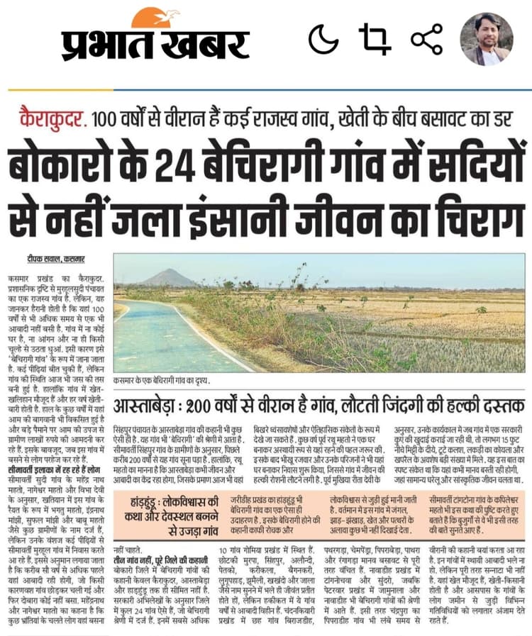 कसमार, बोकारो जिले के बेचिरागी गांवों से जुड़ी स्थिति, इतिहास और विकास की जटिलताओं को लेकर जिला प्रशासन सक्रिय हो गया है. प्रभात खबर में मंगलवार को प्रकाशित विस्तृत खबर जिसमें कैराकुदर, आस्ताबेड़ा, हांड़हुंडू सहित जिले के 24 ऐसे गांवों का उल्लेख किया गया था. यहां वर्षों से स्थायी आबादी नहीं है. इस पर उपायुक्त अजय नाथ झा ने स्वतः संज्ञान लिया है. खबर में इन गांवों के राजस्व रिकॉर्ड में दर्ज होने, खेत-खलिहान और आम बागवानी जैसी गतिविधियों के बावजूद मानव बसावट न होने, लोकविश्वास, ऐतिहासिक कारणों और प्रशासनिक उपेक्षा जैसे पहलुओं को प्रमुखता से उठाया गया था. उपायुक्त अजय नाथ झा ने बेचिरागी गांवों की वास्तविक स्थिति की गहराई से समीक्षा करने का निर्देश दिया है. बैठक में उन सभी बिंदुओं पर चर्चा होगी, जो पूर्व प्रकाशित खबर में सामने आए थे.