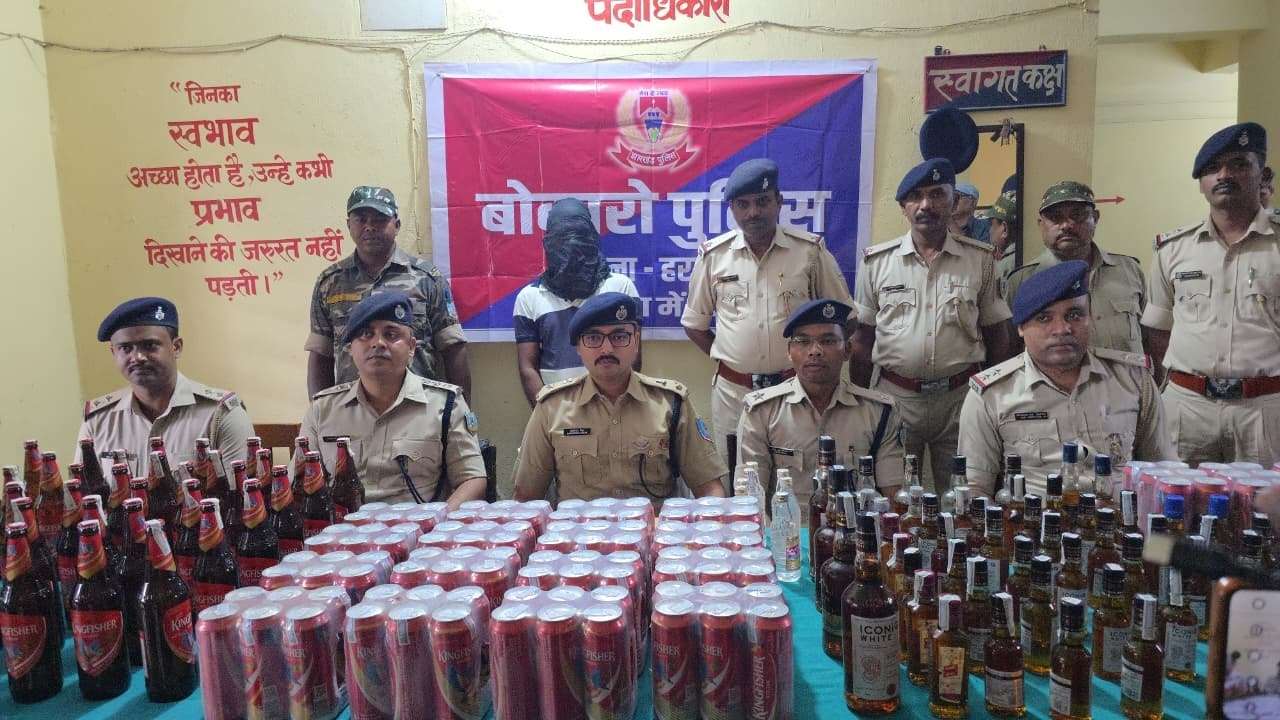 बोकारो, विजयादशमी व दो अक्तूबर को लेकर ड्राइ डे घोषित था. हरला थाना क्षेत्र के सेक्टर नौ राजेंद्र मोड़ स्थित झोपड़ी के समीप जितेंद्र कुमार व मनोज वर्मा द्वारा अवैध रूप से शराब की ब्रिक्री की जा रही थी. शराब पीने के बाद शराबियों द्वारा मेला व रोड पर हुड़दंग किये जाने की सूचना पुलिस को मिली. गुरुवार की रात सूचना का सत्यापन के लिए सिटी डीएसपी आलोक रंजन के नेतृत्व में टीम का गठन किया गया. टीम ने झोपड़ी में छापेमारी की. यह जानकारी शुक्रवार को एसपी हरविंदर सिंह ने पत्रकारों को दी. एसपी ने बताया कि छापेमारी के क्रम में मनोज वर्मा को गिरफ्तार किया गया. जितेंद्र कुमार अंधेरे का फायदा उठा कर फरार हो गया. मनोज के पास से अवैध विदेशी व देशी शराब बरामद किया गया. दोनों आरोपी अस्थायी रूप से हरला थाना क्षेत्र के राजेंद्र मोड़ के रहनेवाले हैं, जबकि स्थायी रूप से बिहार के गयाजी जिला स्थित दुमहान थाना के नैलीदुहल गांव निवासी हैं. दोनों पर हरला थाना में पूर्व से चार आपराधिक मामला दर्ज है. छापेमारी दल में सिटी डीएसपी, हरला इंस्पेक्टर अनिल कच्छप, पुअनि मनीष कुमार गुप्ता, पुअनि मो मोजम्मिल, पुअनि सुरेश यादव, सअनि सुरेश रविदास, सअनि रामनाथ राम, सअनि धन्नजय कुमार, चालक मुंसार अहमद, आरक्षी नरेश मंडल शामिल थे.