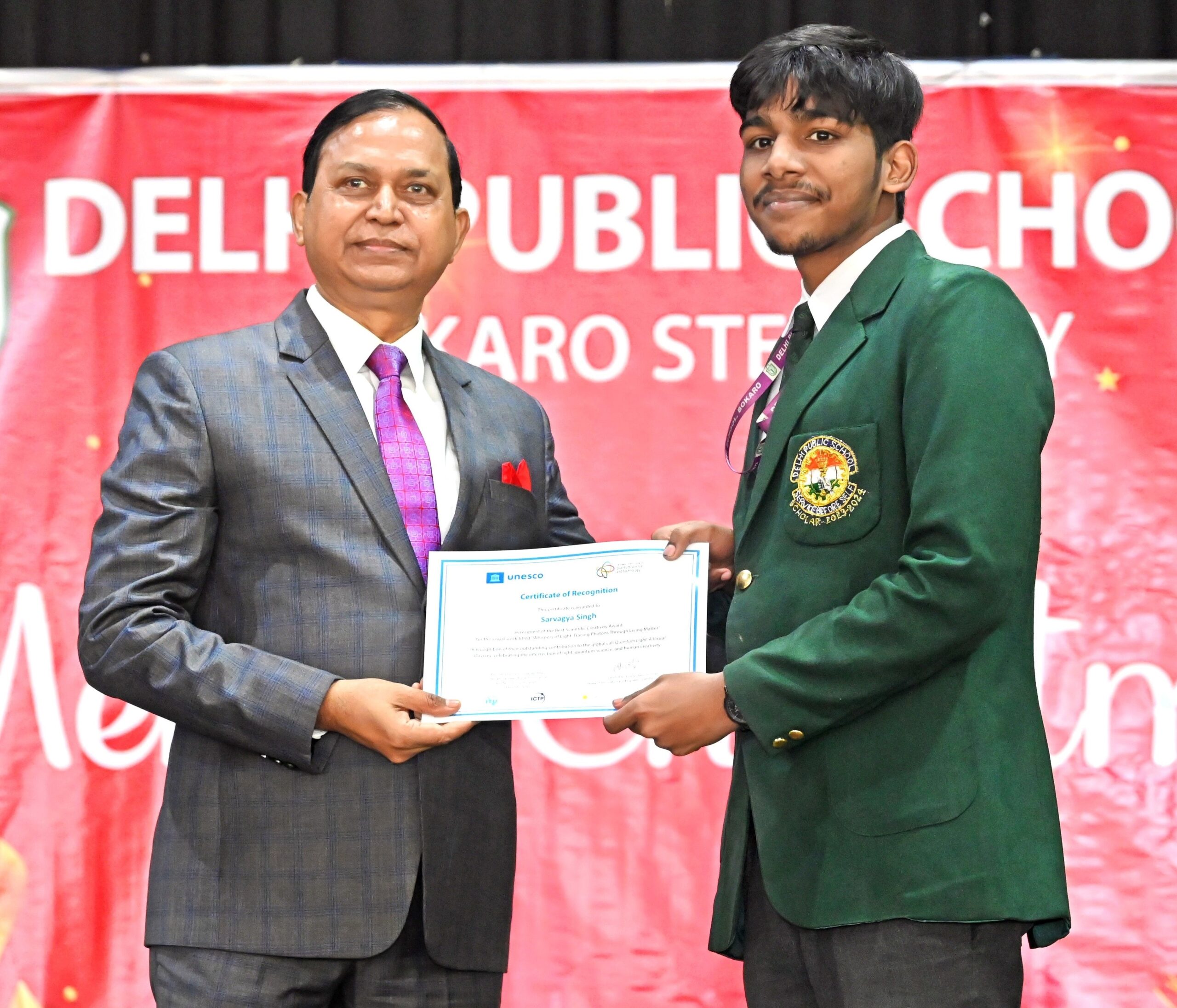 बोकारो, दिल्ली पब्लिक स्कूल, बोकारो के 12वीं क्लास के छात्र सर्वज्ञ सिंह ने वैज्ञानिक प्रतिभा की बदौलत देश का नाम विश्वपटल पर अंकित किया है. यूनेस्को (संयुक्त राष्ट्र शैक्षिक, वैज्ञानिक और सांस्कृतिक संगठन) की ओर से आयोजित प्रकाश संबंधी वैश्विक प्रतियोगिता में सर्वज्ञ ने सर्वश्रेष्ठ वैज्ञानिक रचनात्मकता पुरस्कार (बेस्ट साइंटिफिक क्रिएटिविटी अवार्ड) जीता है. यूनेस्को के इंटरनेशनल इयर ऑफ क्वांटम साइंस एंड टेक्नोलॉजी (आइवाइक्यू 2025) के तहत अंतरराष्ट्रीय प्रकाश दिवस के उपलक्ष्य में आयोजित वैश्विक प्रतियोगिता ‘क्वांटम लाइट: ए विजुअल ओडिसी’ में सर्वज्ञ की दृश्य कृति ‘व्हिस्पर्स ऑफ लाइट- ट्रेसिंग फोटोन्स थ्रू लिविंग मैटर्स’ को दुनिया भर में सर्वश्रेष्ठ चुना गया. 23 दिसंबर को परिणाम घोषित किया गया. यूनेस्को सचिवालय से प्राप्त आधिकारिक सूचना के अनुसार सर्वज्ञ की उपलब्धि को लेख के माध्यम से यूनेस्को की वैश्विक वेबसाइट पर प्रकाशित किया जायेगा. सर्वज्ञ नौकरी करने की बजाय खुद का स्टार्ट-अप शुरू करना चाहता है. प्राचार्य डॉ एएस गंगवार ने कहा कि सर्वज्ञ की कामयाबी ने विद्यालय को गौरवान्वित करने के साथ-साथ हमारे देश की वैज्ञानिक गरिमा को सशक्त किया है. सर्वज्ञ के पिता धनंजय कुमार बीएसएल में महाप्रबंधक व मां रीता कुमार सिंह गृहिणी है.