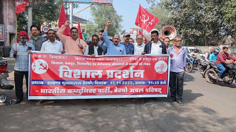 Bokaro News : फुसरो. भारतीय कम्युनिस्ट पार्टी बेरमो क्षेत्रीय परिषद की ओर से आंदोलन सप्ताह के तहत 11 सूत्री मांगों को लेकर गुरुवार को बेरमो प्रखंड कार्यालय के समक्ष प्रदर्शन किया गया. अध्यक्षता जवाहर लाल यादव ने की. प्रदर्शन के बाद मुख्यमंत्री के नाम बेरमो बीडीओ मुकेश कुमार को ज्ञापन सौंपा गया. मौके पर वक्ताओं ने कहा कि पार्टी की ओर से पूरे राज्य में मनाये जा रहे आंदोलन सप्ताह(सात से 15 नवंबर तक) के तहत जन समस्याओं को लेकर प्रदर्शन किया जा रहा है. उन्होंने मांगों पर चर्चा करते हुए कहा कि मईयां सम्मान योजना के अंतर्गत राज्य की सभी महिलाओं को बिना किसी भेदभाव के 2500 रुपये प्रतिमाह करने और उन्हें प्रत्येक महीने की 10 तारीख तक भुगतान की गारंटी सुनिश्चित की जाये, भूमि बैंक रद्द किया जाये एवं गैर मजरूआ जमीन की रसीद काटना चालू करने, 60 वर्ष की आयु पूरी करने वाले सभी किसानों को दस हजार रुपये प्रतिमाह किसान पेंशन योजना लागू करने, सीसीएल और डीवीसी द्वारा किसानों की अधिग्रहीत जमीनों का उचित मुआवजा और नौकरी देने एवं आवश्यकता से अधिक अधिग्रहित जमीनों को किसानों को वापस करने, गरीबों को लाभ पहुंचाने के लिए अबुआ आवास और पीएम आवास बनाने की दिशा में त्वरित कार्रवाई करने, किसानों के खेतों तक पानी पहुंचाने की व्यवस्था, सभी ठेका मजदूरों को न्यूनतम मजदूरी का भुगतान कराने, पलायन पर रोकने के लिए राज्य के बेरोजगार नौजवानों को रोजगार देने, रद्द किये जा रहे राशन कार्ड पर रोक लगाने, त्रिस्तरीय पंचायत चुनाव में चुने गये प्रतिनिधियों को विकास के कार्यों के लिए राशि मुहैया कराने की मांग की गयी. मौके पर चंद्रशेखर झा, सुजीत घोष, आफताब आलम, बृजकिशोर सिंह, मो शाहजहां, गणेश महतो, जानकी महतो, खेमलाल महतो, अमृत महतो, भीमसेन सिंह, असीम तिवारी, मो कमाल, ललन प्रसाद, प्रद्युम्न सोनी, दिनबंधु गोस्वामी, बीके झा सहित कई लोग मौजूद थे.
