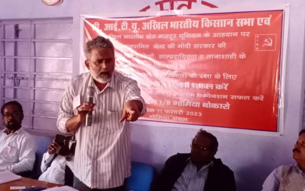ललपनिया, नागेश्वर. बोकारो जिला अंतर्गत गोमिया मे अखिल भारतीय किसान सभा एवं सीटू के बैनर तले उत्तरी छोटानागपुर प्रमंडल स्तरीय कन्वेंशन का आयोजन शनिवार को किया गया. कन्वेंशन की अध्यक्षता सीटू के जिला सचिव प्रदीप कुमार विश्वास, किसान सभा के जिला सचिव श्याम सुंदर महतो एवं अध्यक्ष शकूर अंसारी ने संयुक्त रूप से किया एवं कन्वेंशन का संचालन सीटू के राज्य कमेटी सदस्य राकेश कुमार ने किया.