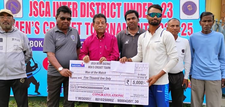 Bokaro News : बोकारो जिला क्रिकेट संघ के तत्वावधान में शनिवार को जेएससीए अंतर जिला अंडर 23 क्रिकेट टूर्नामेंट में ग्रुप डी का अंतिम लीग मैच खेला गया. सेक्टर 4 स्थित बीएसएल किकेट स्टेडियम में खेले गये मैच में रोहित भारती के शतक व विकास कुमार यादव के ऑलराउंड प्रदर्शन की मदद से कोडरमा की टीम ने सरायकेला खरसावां की टीम को 162 रनों के अंतर से पराजित किया. टॉस जीतकर पहले बल्लेबाजी करते हुए कोडरमा की टीम ने 50 ओवर में 6 विकेट खोकर 360 रन बनाया. टीम की ओर से रोहित भारती ने 106, विकास कुमार यादव ने 81,आदित्य राज ने 58 व रजनीश कुमार ने 32 रन बनाये. गेंदबाजी में सरायकेला खरसावां की ओर से हिमांशु ने 74 रन देकर तीन विकेट लिये. जबकि मोहक राज को दो सफलता मिली. जवाबी पारी खेलने उतरी सरायकेला खरसावां की टीम 35.1 ओवर में 198 रनों पर सिमट गयी. टीम की ओर से रौनक राज ने 90 व माधव गुप्ता ने 24 रन बनाये. गेंदबाजी में कोडरमा की ओर से कुमार हेमंत ने 31 रन देकर तीन विकेट लिए. जबकि विकास कुमार यादव व आशीष कुमार को दो-दो सफलता मिली. मैच में शानदार शतक के लिए कोडरमा के रोहित भारती को प्लेयर ऑफ द मैच का कैश मनी अवार्ड जेएससीए के आजीवन सदस्य अजय चौधरी ने सौंपा. मौके पर मैच के टीआरडीओ सुब्रत दास, अंपायर संजीव रंजन, प्रशांत कुमार, स्कोरर दीपक कुमार, अनिल कुमार, अजय पाठक, अजय कुमार, योगेंद्र कुमार, गजेंद्र कुमार, सजल राज आदि उपस्थित थे.