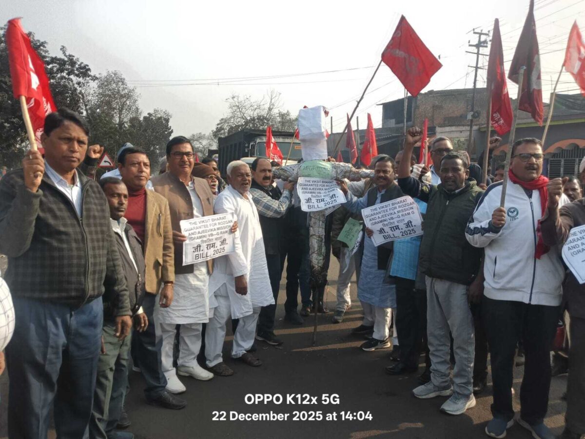 जारंगडीह स्थित भगत सिंह चौक में सोमवार को वामपंथी दलों ने केंद्र सरकार और वीबी गारंटी रोजगार एवं आजीविका मिशन ( ग्रामीण) अधिनियम का पुतला जलाया. वक्ताओं ने कहा कि वर्ष 2005 में यूपीए-1 की सरकार ने दुनिया की सबसे बड़े काम की गारंटी देने वाली स्कीम नरेगा को पारित किया. वर्ष 2009 में इसका नाम मनरेगा रखा गया. पहली बार केंद्र सरकार ने परिवार के एक इच्छुक सदस्य को 100 दिन का रोजगार देने की कानूनी गारंटी दी. मनरेगा मांग आधारित एक स्कीम थी. गांव में रहने वाले किसी भी व्यक्ति को अगर योजना के अंतर्गत काम चाहिए तो उसका काम देने की और भुगतान की गारंटी थी. लेकिन नये विधेयक में केंद्र सरकार हर राज्य के लिए फंड का आवंटन निर्धारण करेगी. मनरेगा अकुशल मजदूरों के लिए योजना थी, जिसमें मजदूरी का शत प्रतिशत बजट केंद्र सरकार देती थी. अब नयी स्कीम में 60% केंद्र और 40% राज्य देगी, जो असंभव है. इस अवसर भाकपा के लखन लाल महतो, चंद्रशेखर झा, गणेश प्रसाद महतो, जवाहरलाल यादव, ब्रज किशोर सिंह, भीम महतो, जितेंद्र दुबे, परण महतो, बलराम नायक, यदू उरांव, विश्वनाथ महतो, सुरेश प्रसाद शर्मा, नवीन कुमार विश्वकर्मा, मथुरा सिंह यादव, देवाशीष रजवार, खुबाली मंडल, विक्रम कुमार, जितेंद्र महतो, माकपा के भागीरथ शर्मा, मनोज पासवान, विजय भोई, श्याम बिहारी सिंह दिनकर, कमलेश गुप्ता, निजाम अंसारी, कमलेश गुप्ता, समीर सेन, नरेश राम, मुस्तफा अंसारी, भोला रजक, माले के भुवनेश्वर केवट, विकास सिंह, बालेश्वर गोप, बालेश्वर यादव, अजय रविदास आदि थे.