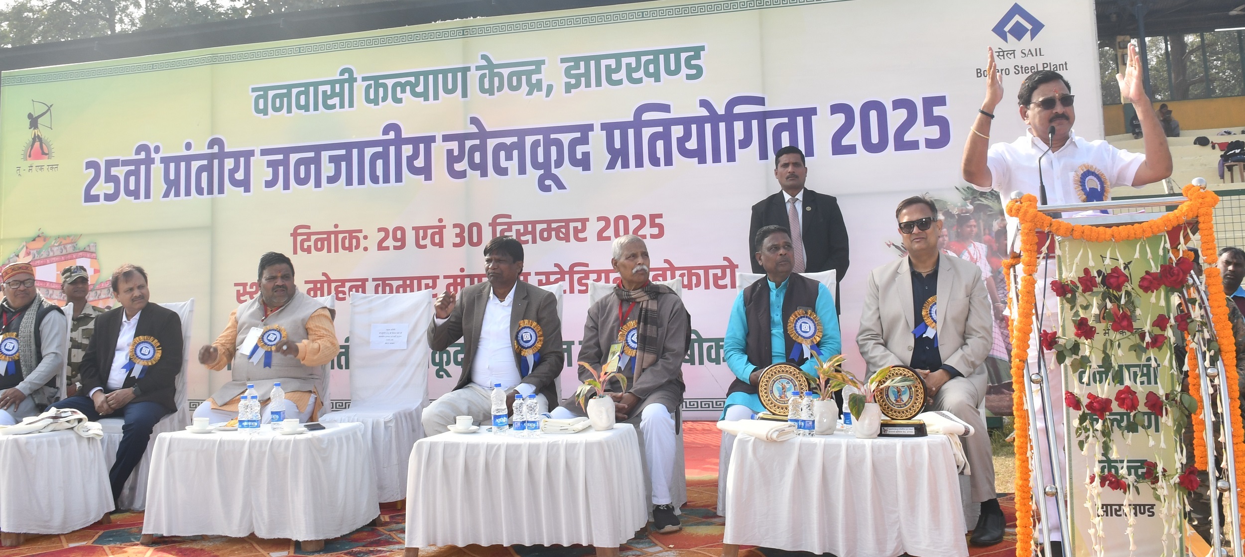 वनवासी कल्याणकेंद्र, झारखंड के तत्वावधान में 25वीं जनजातीय खेलकूद प्रतियोगिता-2025 का रंगारंग आगाज सेक्टर चार स्थित मोहन कुमार मंगलम स्टेडियम में हुआ. उद्घाटन मुख्य अतिथि केंद्रीय इस्पात व भारी उद्योग राज्य मंत्री भूपति श्रीनिवास वर्मा, मुख्य वक्ता नगरी कल्याण आश्रम के क्षेत्रीय संगठन मंत्री प्रफुल्ल आकांत, विशिष्ट अतिथि अखिल भारतीय खेल छात्रावास( वनवासी कल्याण आश्रम) के प्रमुख प्रबोधनंद, धनबाद के सांसद ढुलू महतो, वनवासी कल्याण केंद्र झारखंड के महामंत्री धनंजय सिंह, बोकारो स्टील प्लांट के निदेशक प्रभारी प्रिय रंजन, आरएसएस के विभाग कार्यवाह धीरेंद्र गोप, आयोजन समिति के अध्यक्ष दीपक गुप्ता व सचिव अनिल कुमार ने भारत माता, भगवान श्रीराम, भगवान बिरसा मुंडा, बाला साहेब देश पांडे व जगदेव राम उरांव के चित्र के समक्ष दीप प्रज्वलित व पुष्पांजलि कर की. अतिथि परिचय का कार्य वनवासी कल्याण केंद्र के प्रांत संगठन मंत्री सुशील मरांडी ने किया. मुख्य अतिथि सहित मंचासीन अतिथियों का स्वागत स्मृति चिह्न, अंग वस्त्र व पौधा प्रदान प्रदान कर वनवासी कल्याण केंद्र की ओर से किया गया. अपने संबोधन में मुख्य अतिथि भूपति राजू श्रीनिवास वर्मा ने कहा : इस प्रकार का कार्यक्रम जनजातीय बच्चों को चमकने का मंच प्रदान कराता है. खेल राष्ट्र निर्माण की शक्ति है. भारतीय खेलों में जनजातीय खिलाड़ियों का योगदान अत्यधिक है. भारत सरकार की ओर से भी खेल व स्वास्थ्य के प्रति विशेष ध्यान दिया जा रहा है. आयोजन समिति के अध्यक्ष दीपक गुप्ता ने स्वागत भाषण देते हुए आयोजन के उद्देश्यों से अवगत कराया.जनजातीय समाज के सर्वांगीण विकास की दिशा में प्रयासरत : प्रफुल्ल आकांत