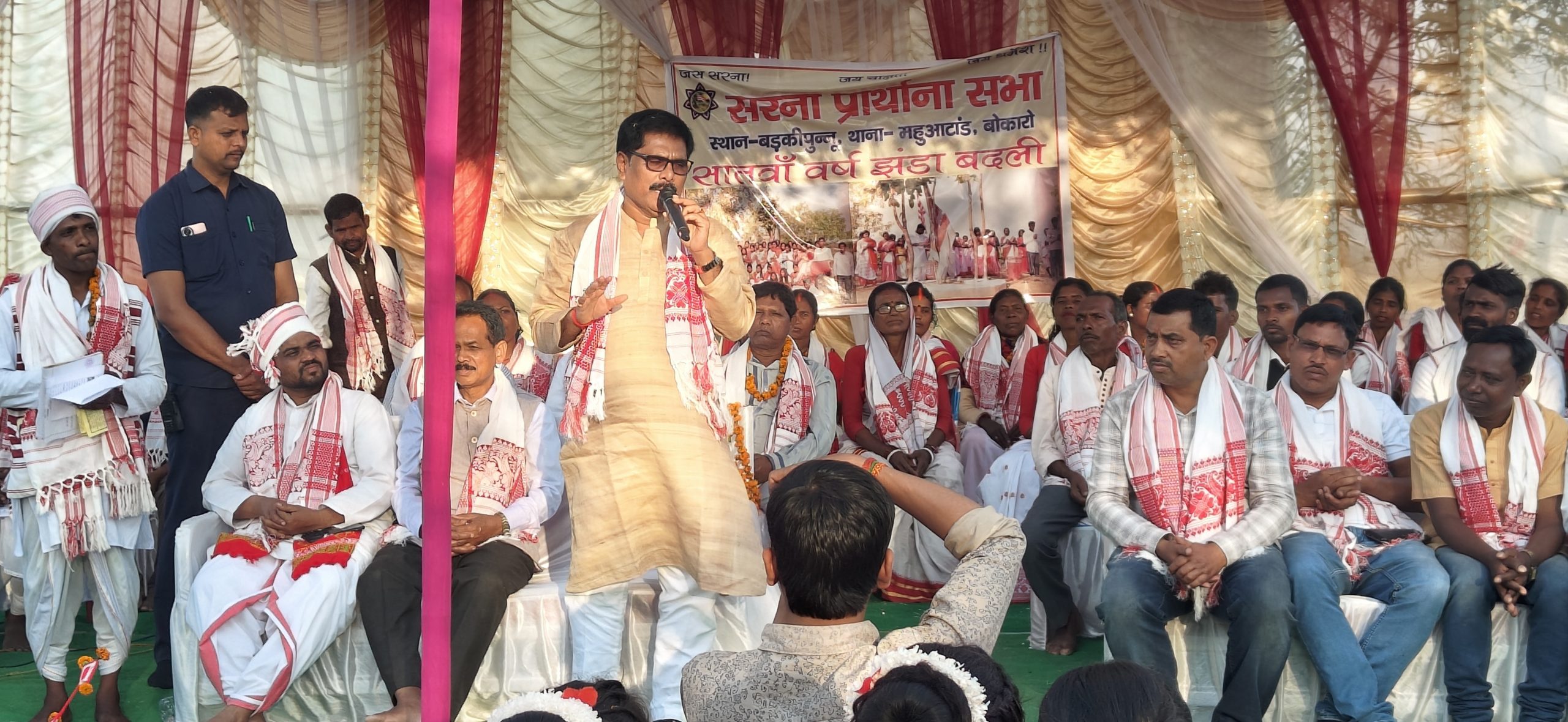 महुआटांड़. बड़कीपुन्नू सरना स्थल में शनिवार को सार्वजनिक सरना आदिवासी युवा समिति के बैनर तले सरना प्रार्थना सभा सह सातवां वार्षिक झंडा बदली कार्यक्रम का आयोजन किया गया. पाहन नरेश मुंडा, रामकिशुन मुंडा व बसंत ने पूजा करायी. इसके बाद प्रसाद वितरण हुआ. मुख्य अतिथि सूबे के पेयजल, स्वच्छता एवं उत्पाद तथा मद्य निषेध मंत्री योगेंद्र प्रसाद ने सरना स्थल में मत्था टेका. संबोधन में कहा कि आदिवासियों की संस्कृति व परंपरा बेमिसाल है. इसके संरक्षण व विकास के प्रति आदिवासियों की जागरूकता उत्कृष्ट उदाहरण है. उन्होंने कहा कि हेमंत सरकार सभी के उत्थान और विकास के लिए कृतसंकल्पित है. मंईयां सम्मान योजना से महिलाएं सशक्त होंगी. विशिष्ट अतिथि सरना प्रार्थना सभा के राष्ट्रीय अध्यक्ष नीरज मुंडा, प्रदेश धर्मगुरु राजेश लिंडा, उत्तरी छोटानागपुर धर्मगुरु रामदेव उरांव, प्रदेश उपाध्यक्ष बिगू उरांव, हजारीबाग जिला धर्मगुरु बबन तिग्गा, चतरा धर्मगुरु सोमरा उरांव, हजारीबाग जिलाध्यक्ष विनीता तिग्गा, महिला प्रकोष्ठ रांची महानगर की सुभानी तिग्गा, ममता उरांव, सीता उरांव, लुदू मांझी, पूर्व मुखिया संजय कुमार, पंसस निमाय सिंह, पूर्व उप प्रमुख गिरिधारी महतो, कुलदीप शर्मा, संजय साव, मुंशी महतो आदि ने परंपरा व संस्कृति के संरक्षण व विकास के प्रति जागरूक रहने का संदेश दिया. आयोजन में मुख्य सह संयोजक शिवशंकर मुंडा, नरेश कुमार मुंडा, अध्यक्ष किशोर मुंडा, राजू मुंडा, देवंती देवी, सचिव भोला मुंडा, रामकिशुन मुंडा, कोषाध्यक्ष सुरेंद्र मुंडा, आशा मुंडा व सुनील मुंडा, संरक्षक सिकंदर मुंडा, सकलदेव, प्रेमजीत, संजय, रितु, गोविंद, वीरेंद्र, बसंत, प्रकाश, मिथुन, सुभाष आदि का योगदान रहा.